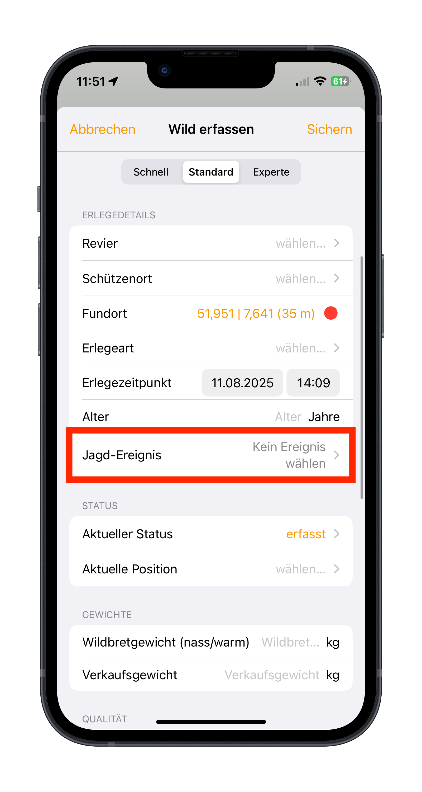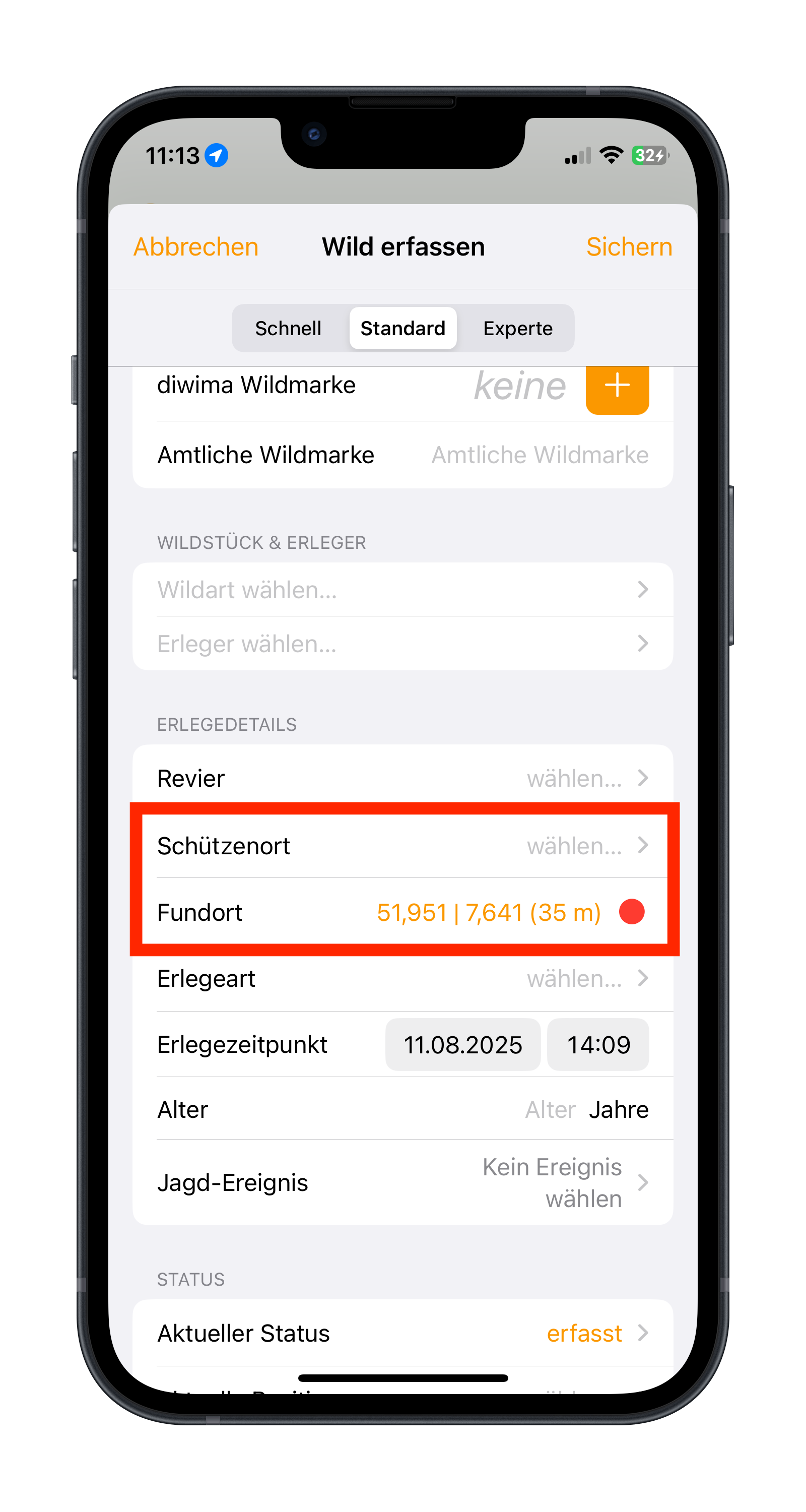 - Sie können außerdem die aktuelle Position des Wildstücks dokumentieren