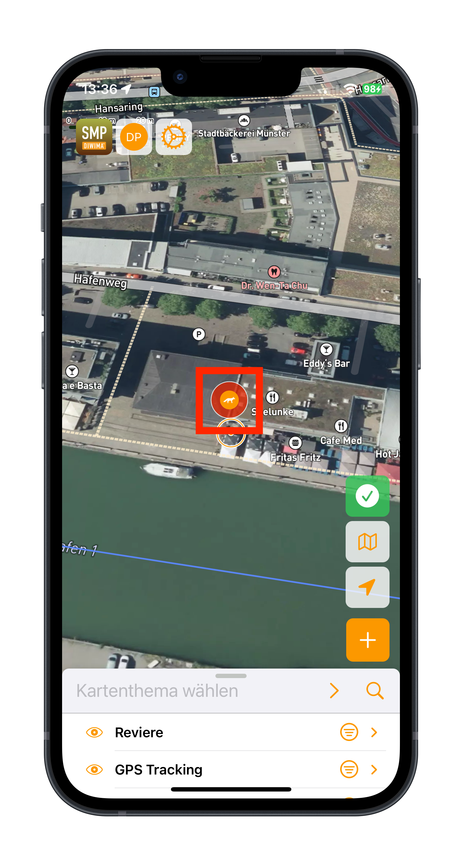Der aktuelle Bearbeitungsstand des Wildstücks kann in der Karte eingesehen werden. Öffnen Sie dazu die SmartMap und navigieren Sie zu dem erfassten Wildstück. Der jeweils ausgewählte Status bestimmt die Farbe mit dem das Wildstück in der Karte angezeigt wird (In diesem Fall hat der Status "erfasst" die Farbe Rot). Im Artikel "Wie pflege ich Stammdaten im Revier?" sehen Sie Schritt-für-Schritt wie Sie individuelle Status anlegen und die Farbe anpassen.