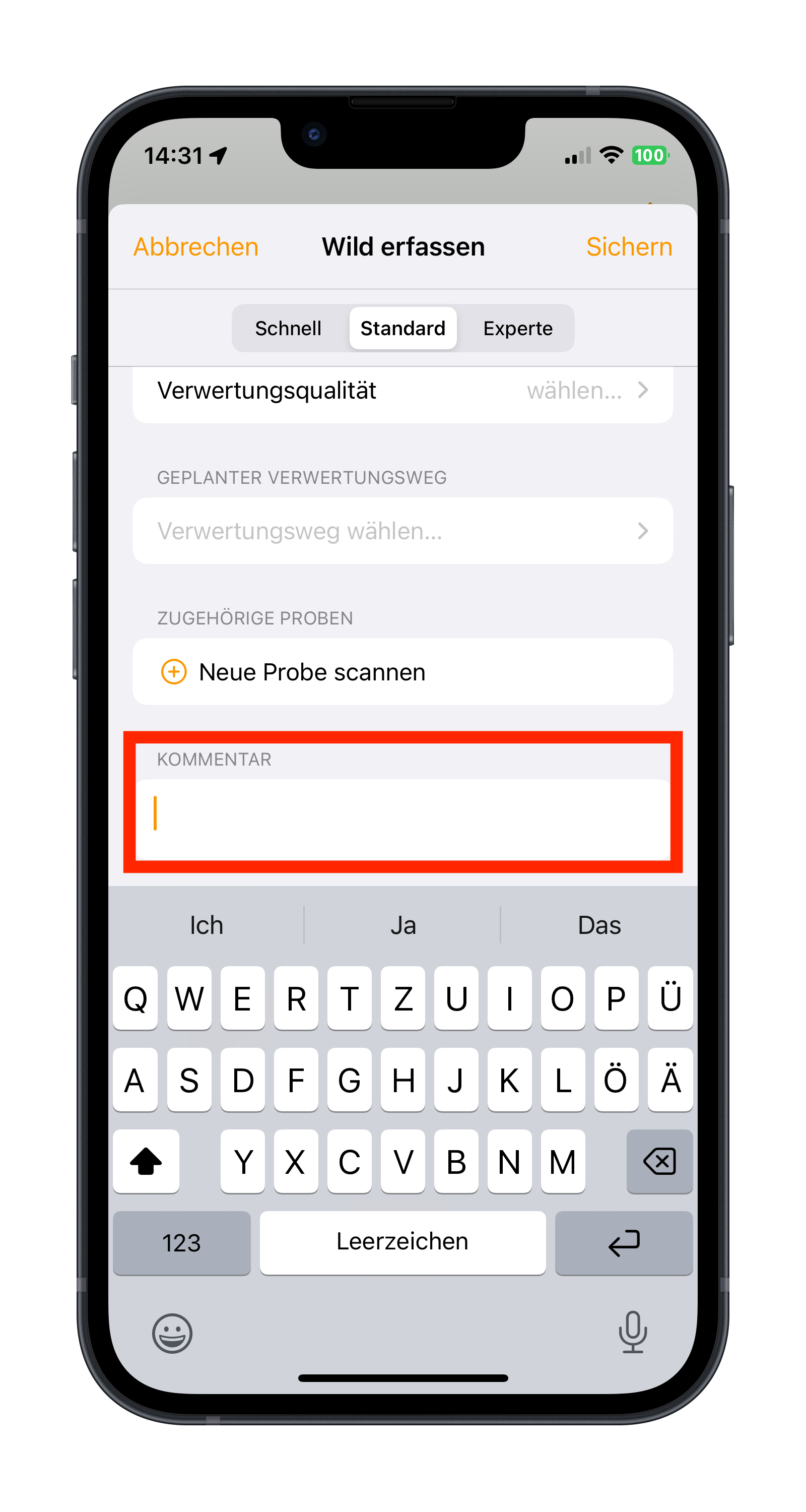Klicken Sie auf das "Kommentar" Feld können Sie dort Besonderheiten des Wildstücks hinterlegen, bspw. "Hegeabschuss". Damit können Sie die Wildstücke noch genauer dokumentieren.