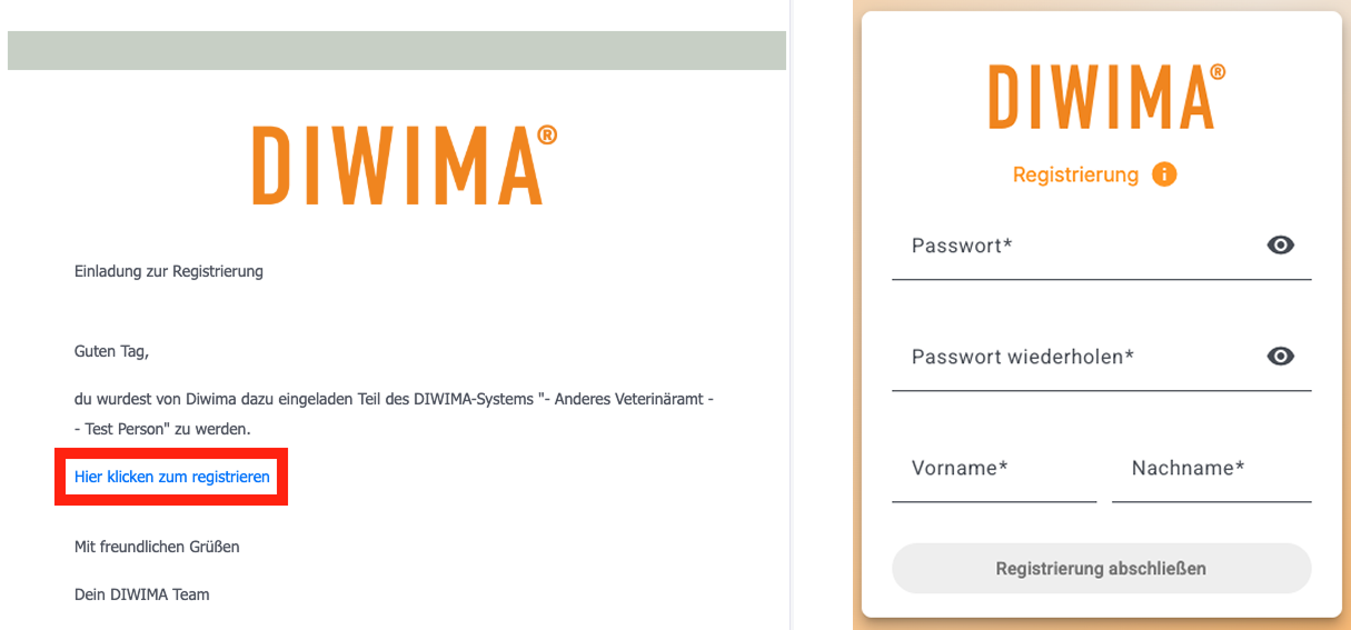 3. Sie erhalten nun eine E-Mail mit einem Registrierungslink. Außerdem erhalten Sie eine weitere E-Mail mit einer Anleitung zum Einstieg in das Diwima-System.