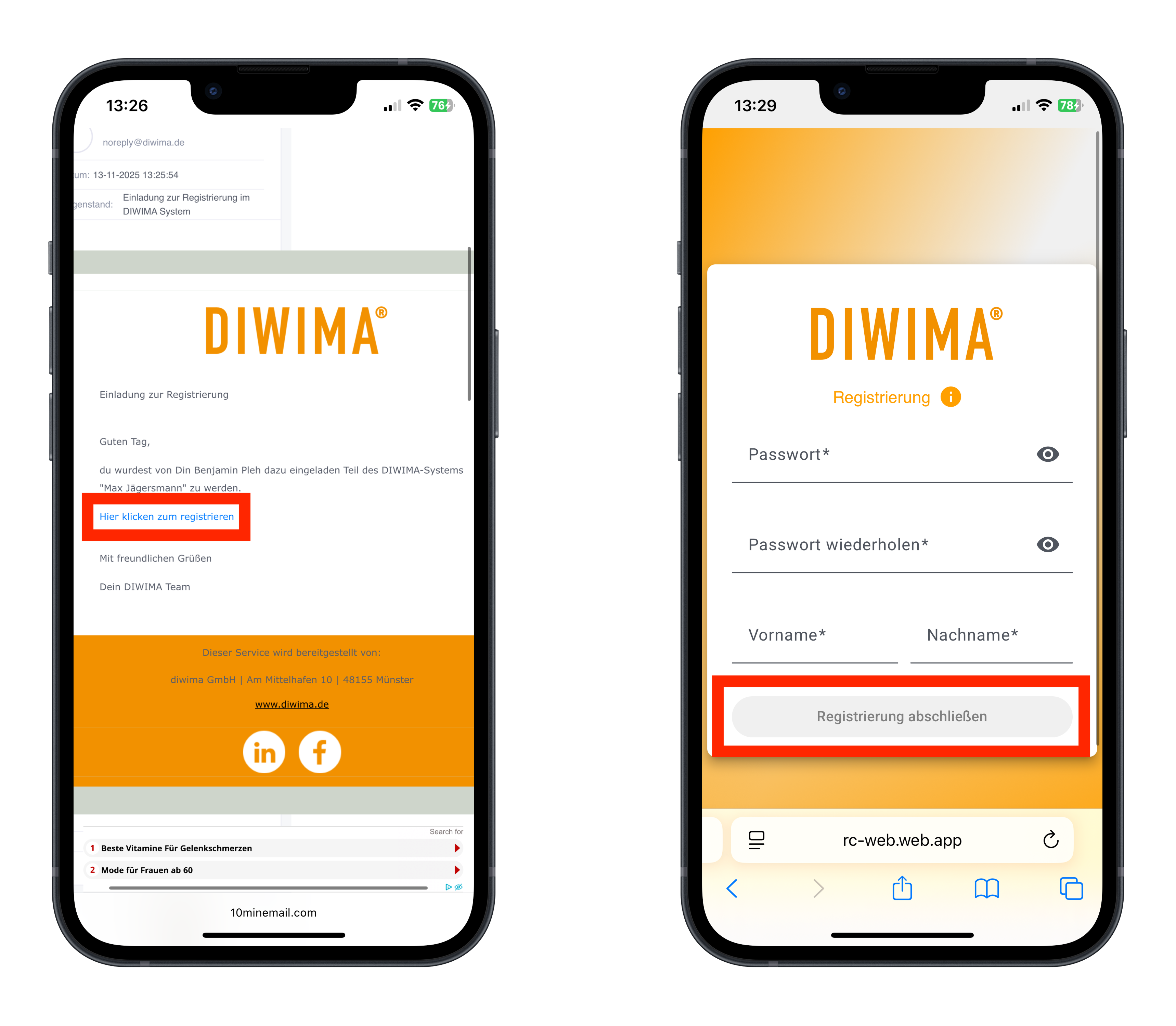 - Der eingeladene Benutzer erhält eine E-Mail mit einem Registrierungslink. Klicken Sie den Link an und setzen Sie ein Passwort. Außerdem muss der Vor- und Nachname angegeben werden. Klicken Sie abschließend auf "Registrierung abschließen".