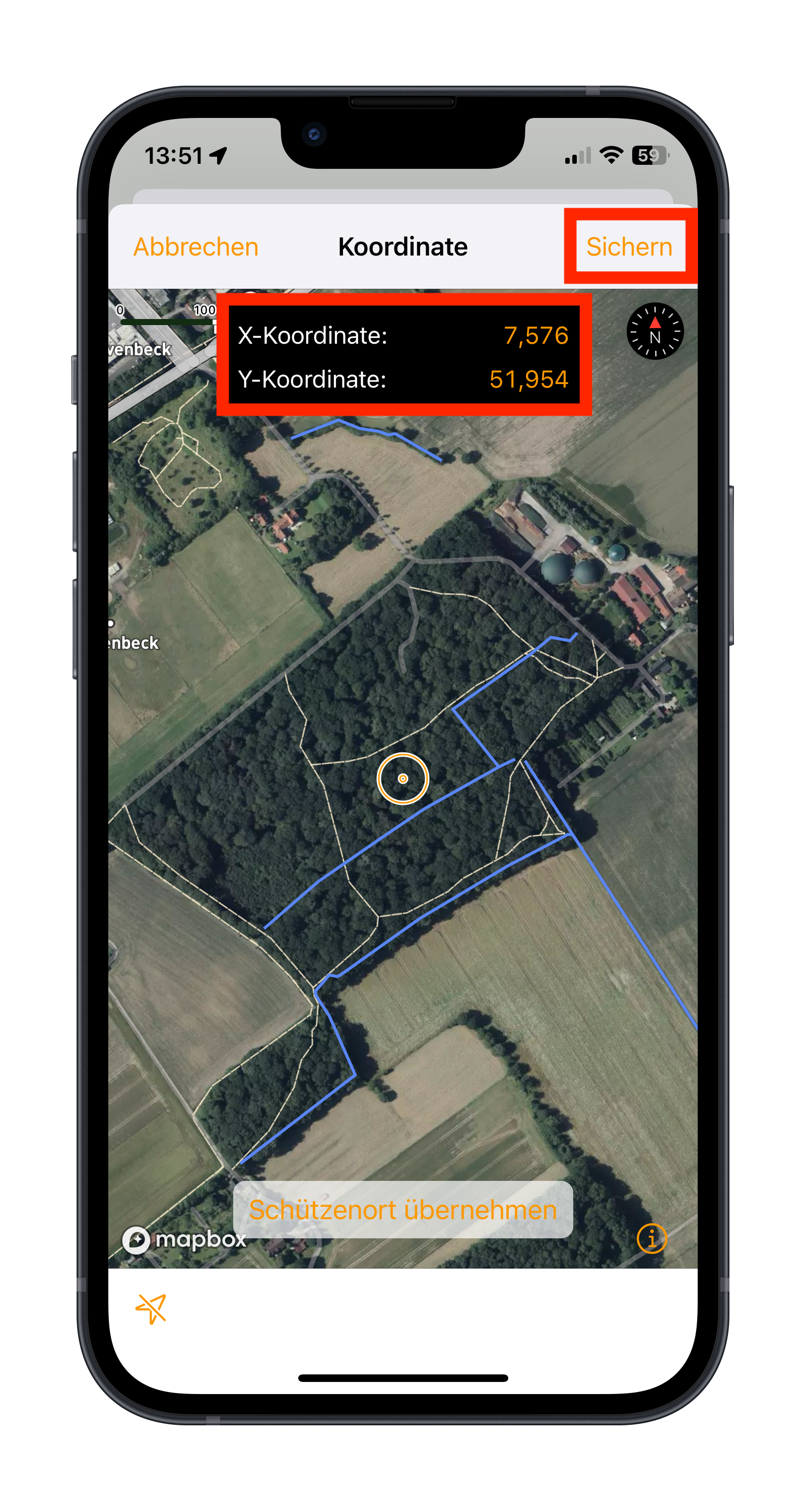 Sie können für den Fundort auch die Koordinaten des Standes einsetzen, von dem aus das Stück erlegt wurde. Um diese Funktion nutzen zu können, muss bereits ein Schützenort ausgewählt worden sein, wie bereits in diesem Artikel beschrieben.