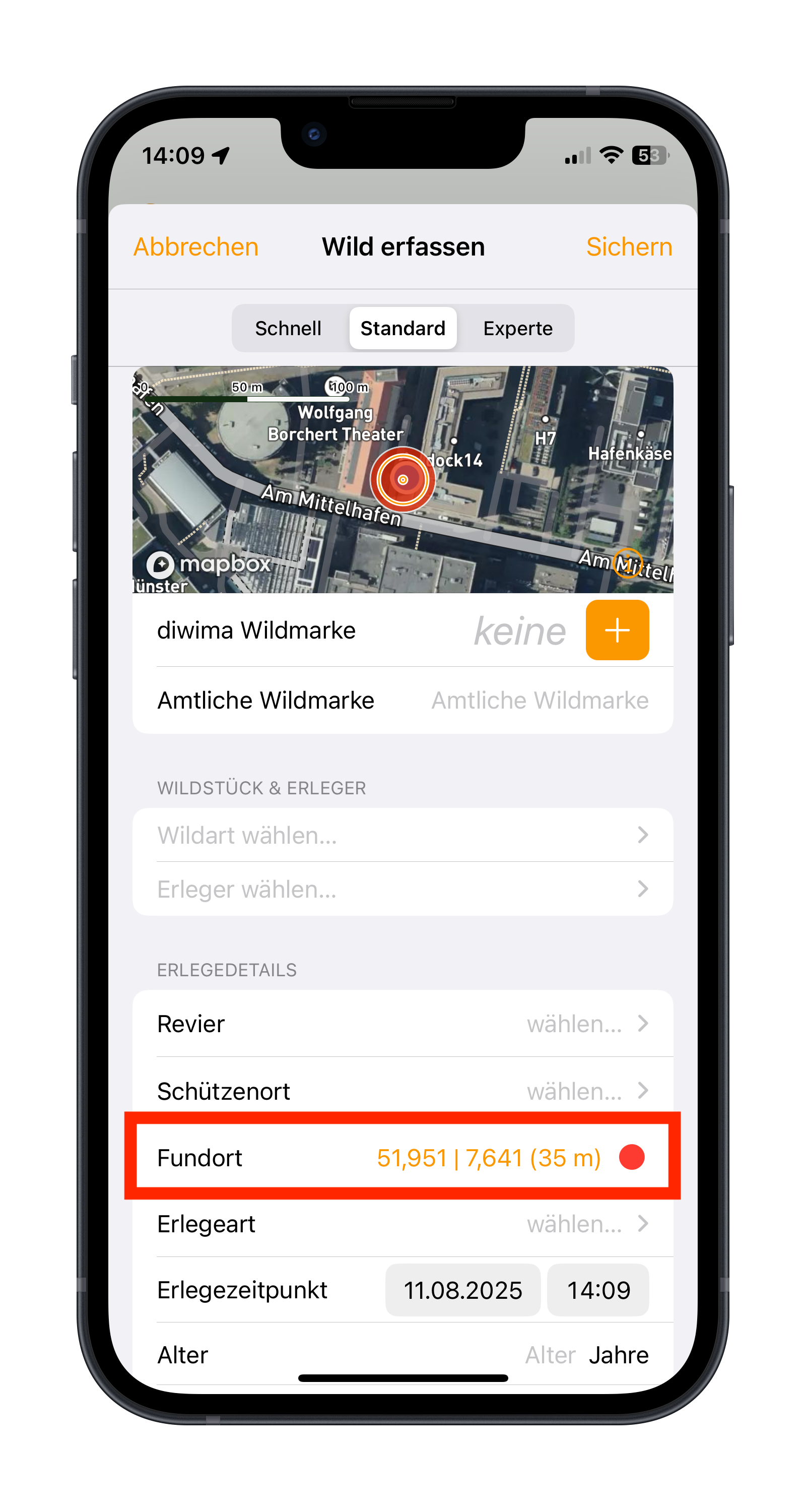 - Im Fundort sind automatisch Ihre derzeitigen GPS-Koordinaten angeben. Falls Sie sich am gefundenen Wildstück befinden, können Sie die Angaben sichern und erhalten somit eine präzise Fundortangabe.