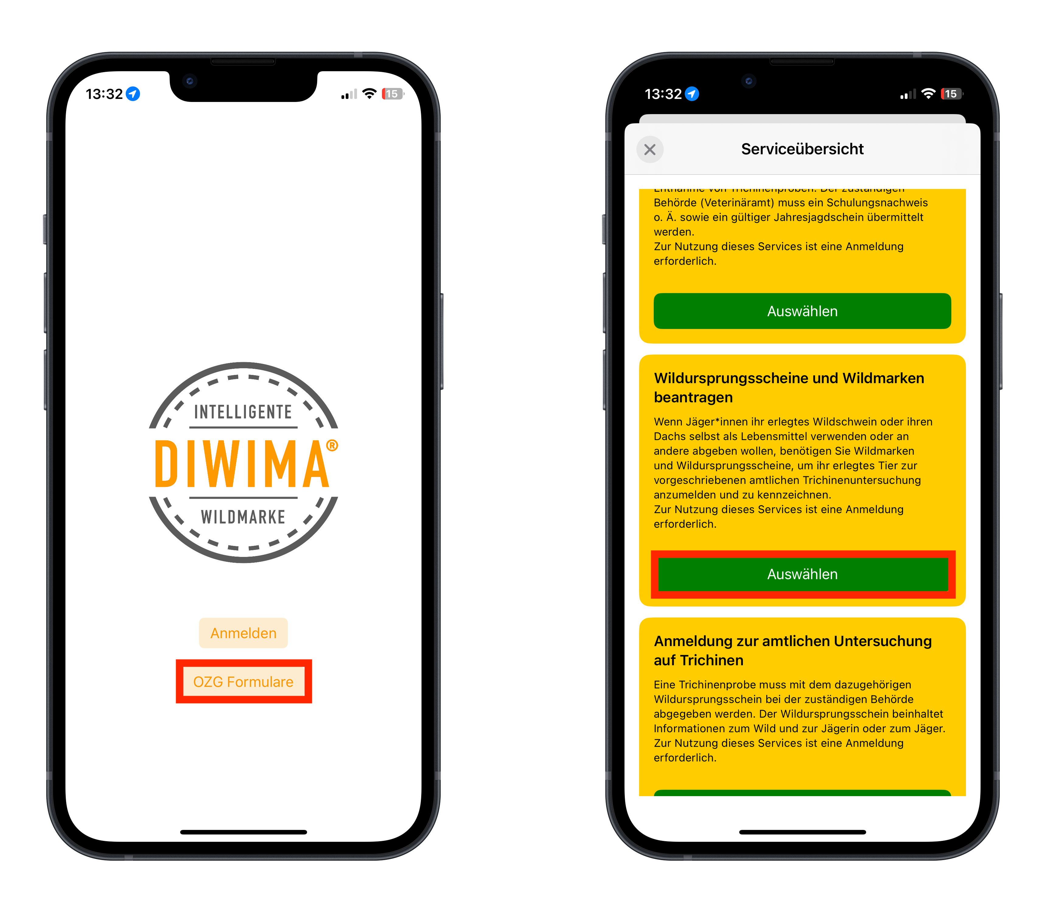 3. Gehen Sie zum Formular "Wildursprungsscheine und Wildmarken beantragen" und klicken Sie auf "Auswählen"