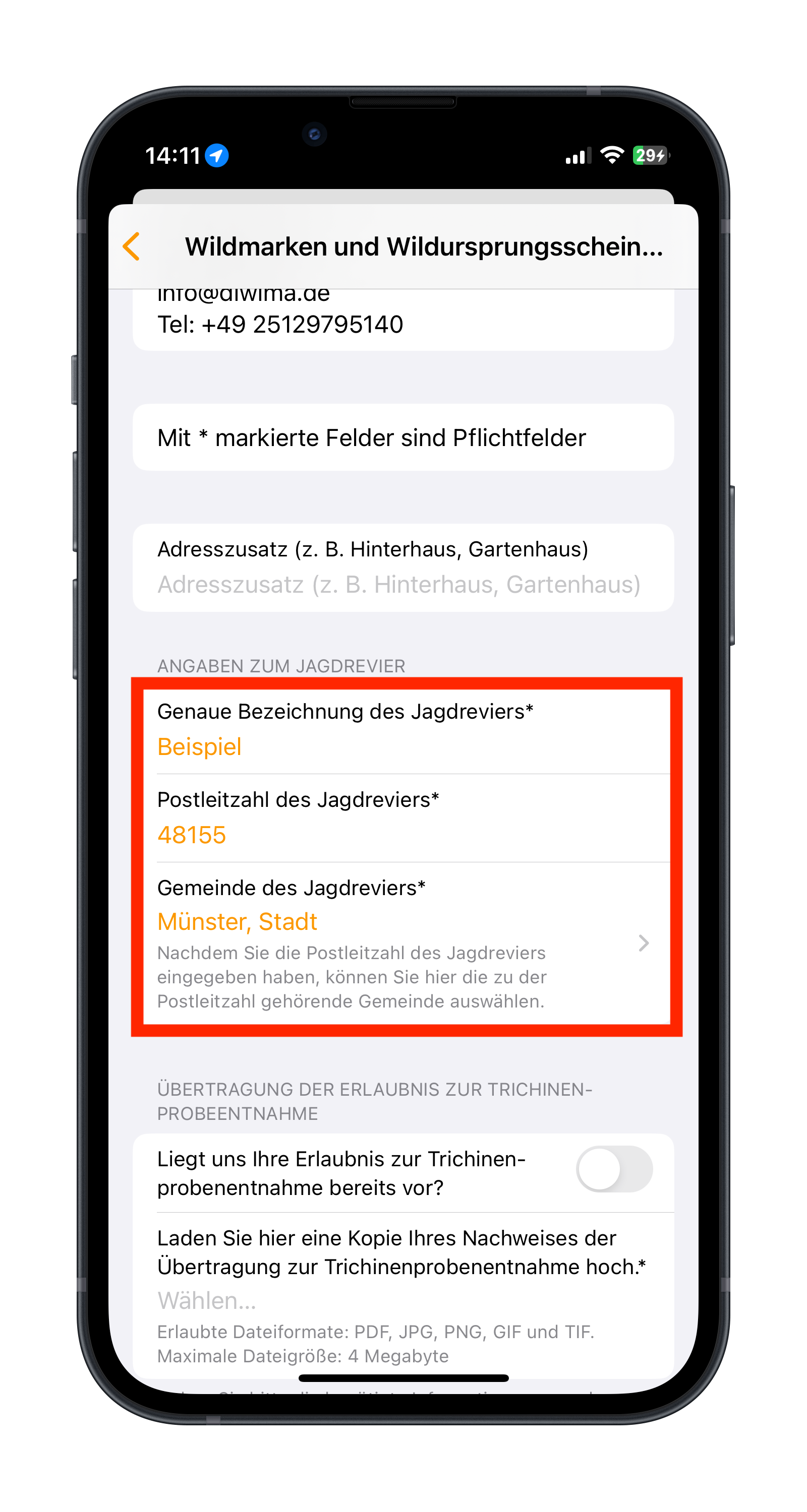 1. Geben Sie zunächst die genaue Bezeichnung des Jagdreviers sowie die Postleitzahl an