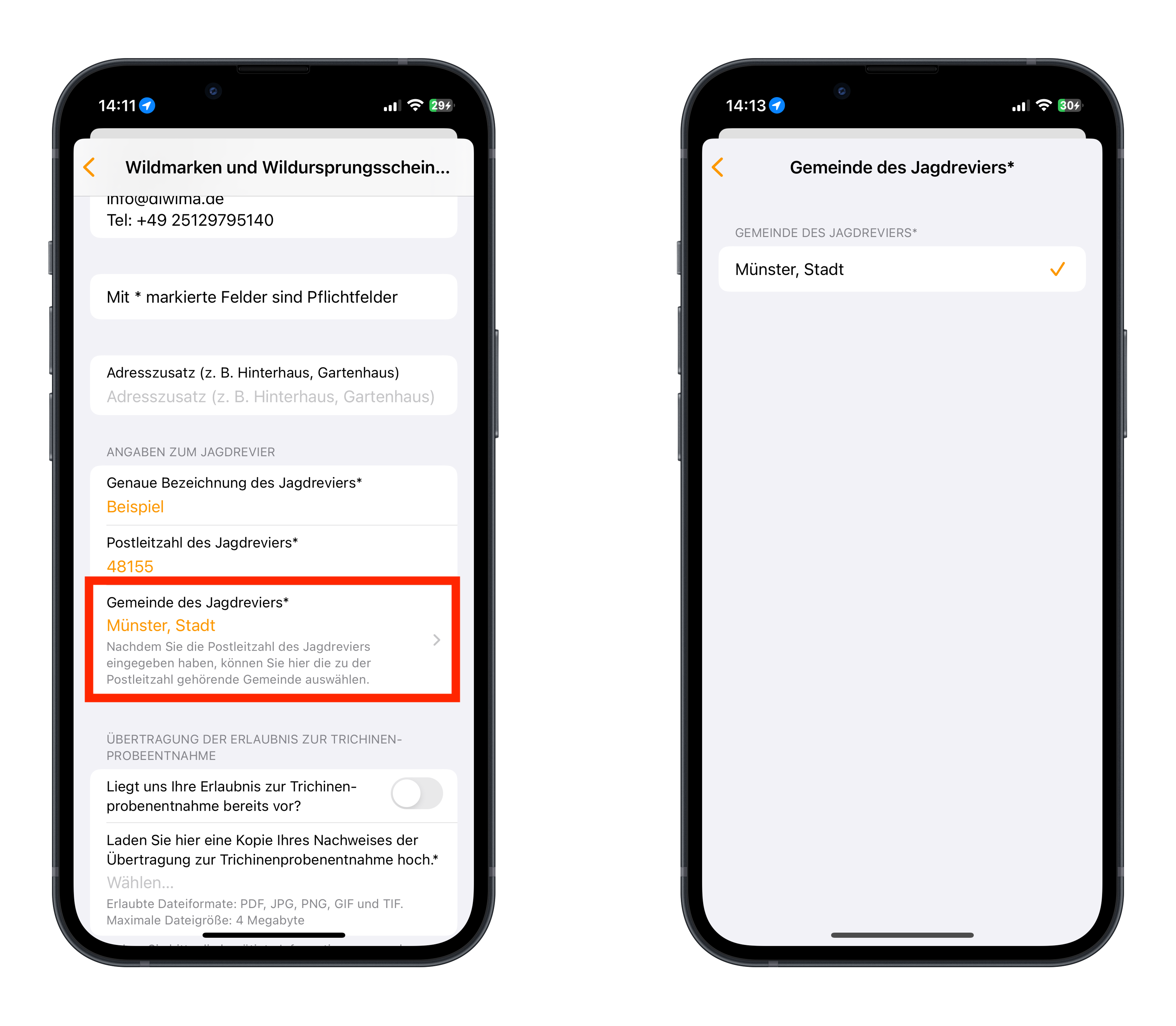Um die Wildursprungsscheine und Wildmarken zu beantragen, müssen Sie zunächst Ihre zuständige Kommune ermitteln. Ihnen wird automatisch Ihre zuständige Kommune basierend auf Ihrer aktuellen GPS Position vorgeschlagen. Alternativ können Sie Ihre Stadt/Postleitzahl in die Suchleiste eingeben. Wählen Sie die gewünschte Kommune aus.
