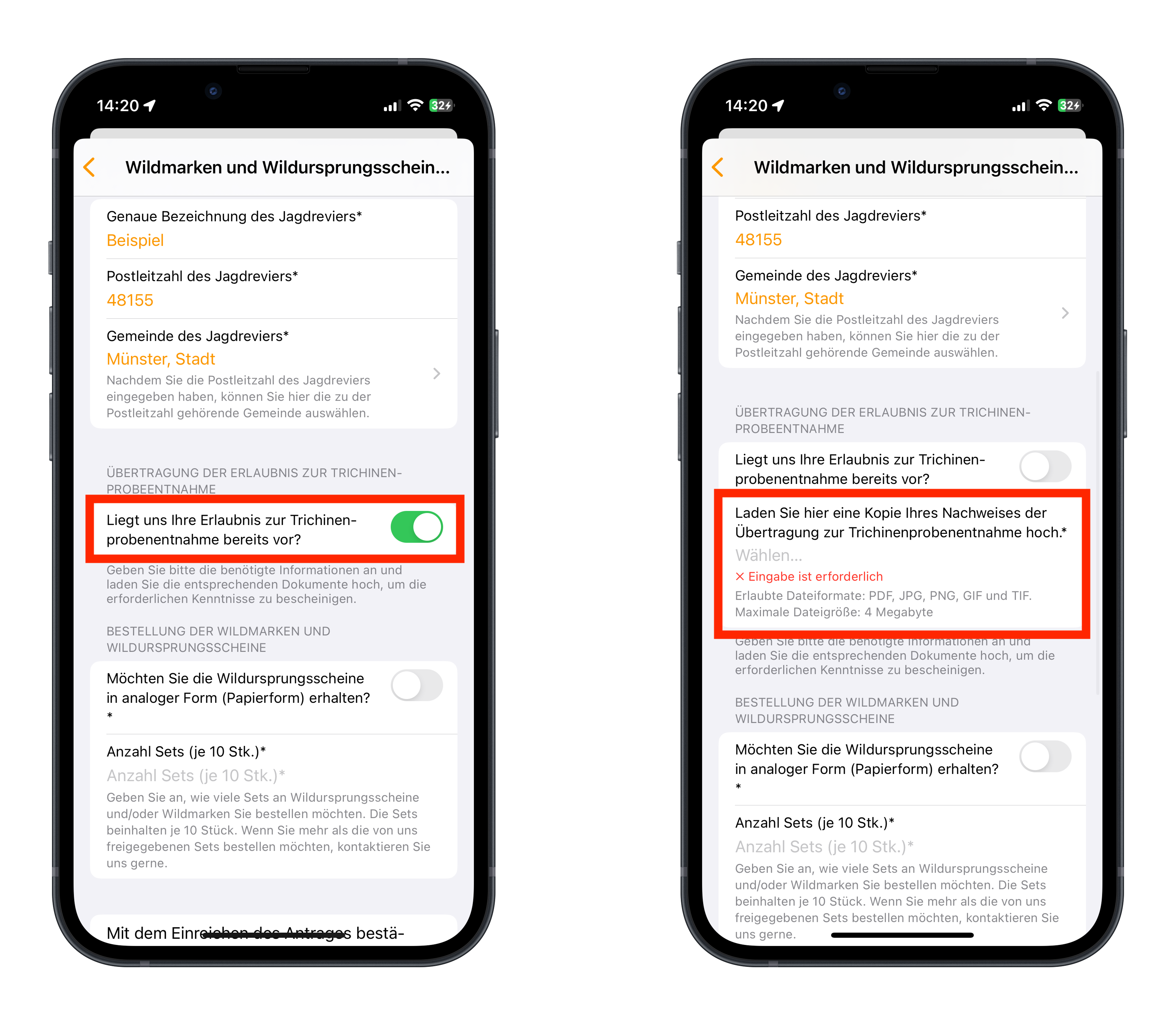 Sollte eine Erlaubnis zur Trichinenprobenentnahme bereits vorliegen, klicken Sie den Schalter an. Falls nicht, klicken Sie das darunterliegende Feld an und laden Sie eine Kopie des Nachweises hoch.