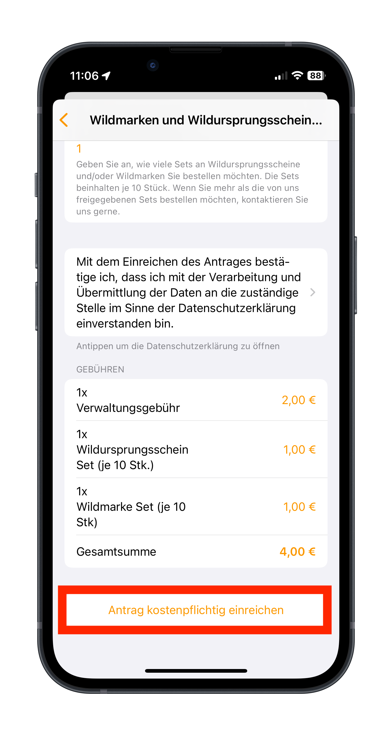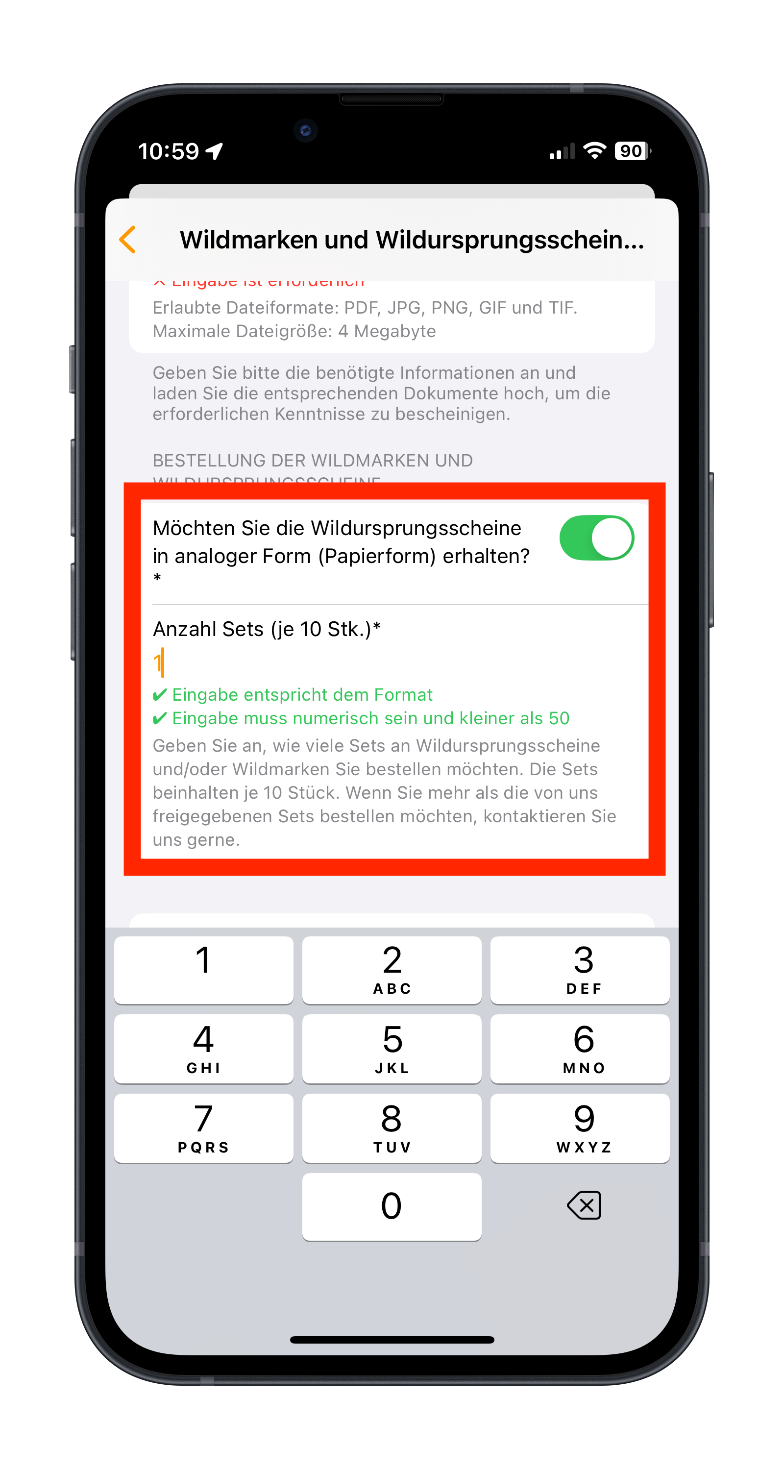 Im nächsten Schritt bestellen Sie die Wildmarken bzw. Wildursprungsscheine. Sollten Sie die Wildursprungsscheine in analoger Form erhalten wollen, klicken Sie den Schalter an. Im darunterliegenden Feld können Sie die Menge an Sets der Wildmarken bzw. Wildursprungsscheine eingeben. Ein Set enthält jeweils 10 Stück.
