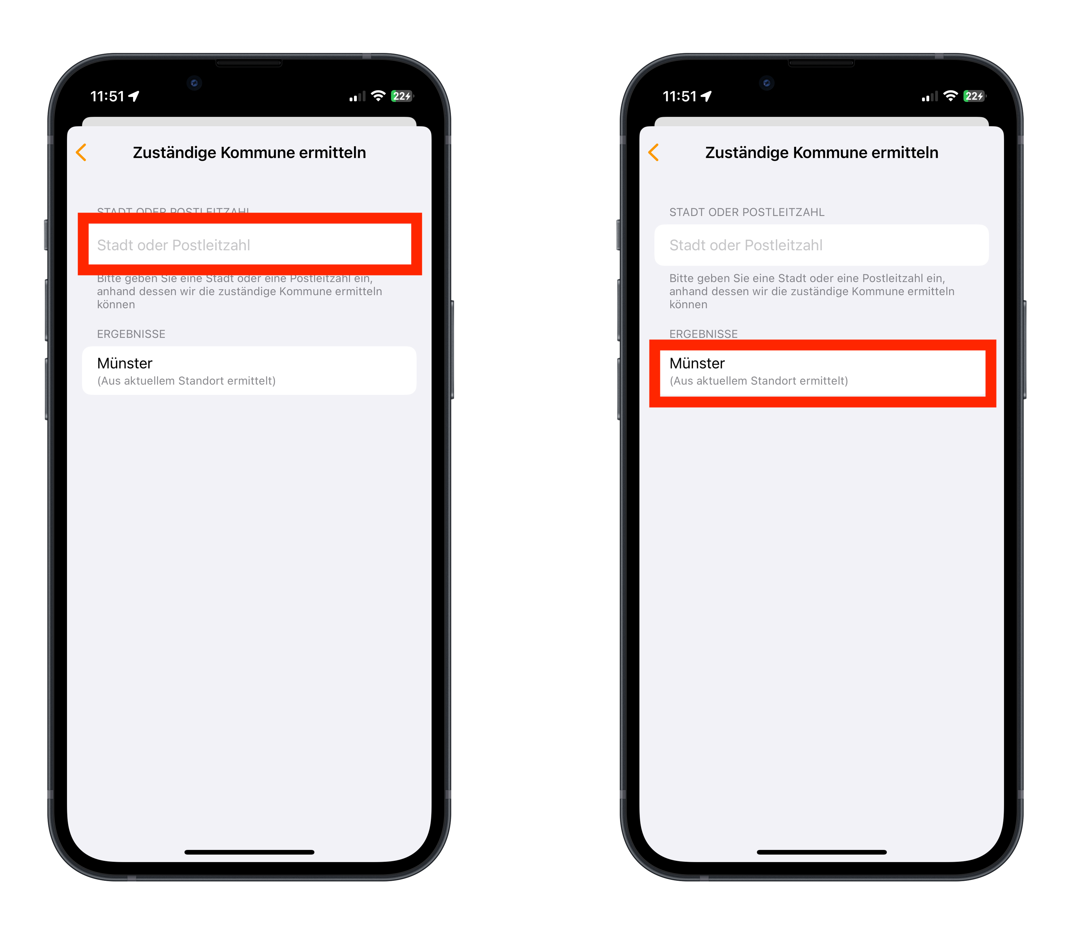 1. Nachdem Sie die Postleitzahl angegeben haben, können Sie die zuständige Gemeinde auswählen