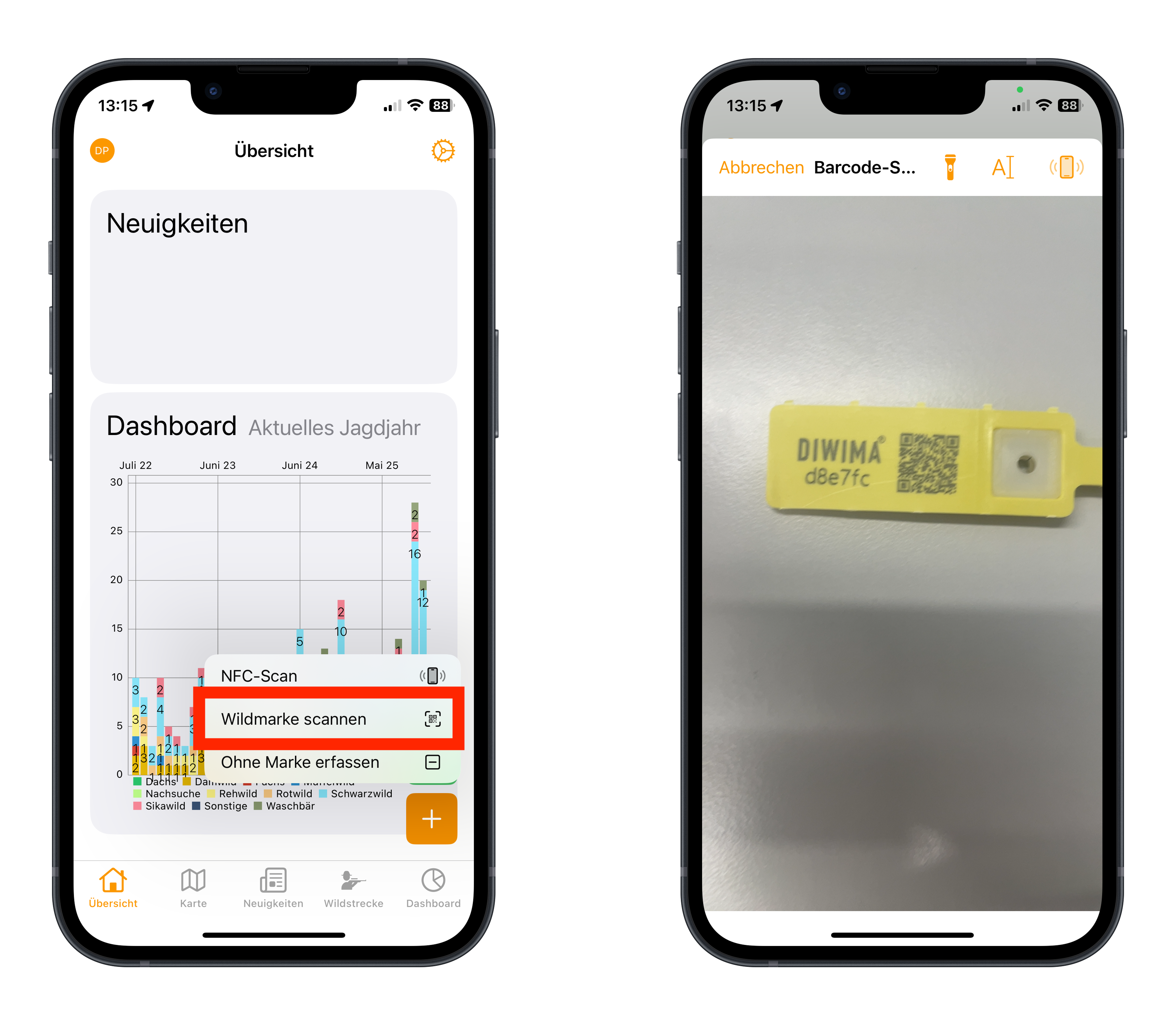 Befestigen Sie die Wildmarke noch am Erlegungsort am Wildstück. Beachten Sie dabei die betrieblichen Anweisungen/ Landesregelungen bezüglich des Befestigungsortes. Öffnen Sie die diwima® Wildmarke App und scannen Sie die Marke ein. Daraufhin öffnet sich das „Wild erfassen“-Fenster.