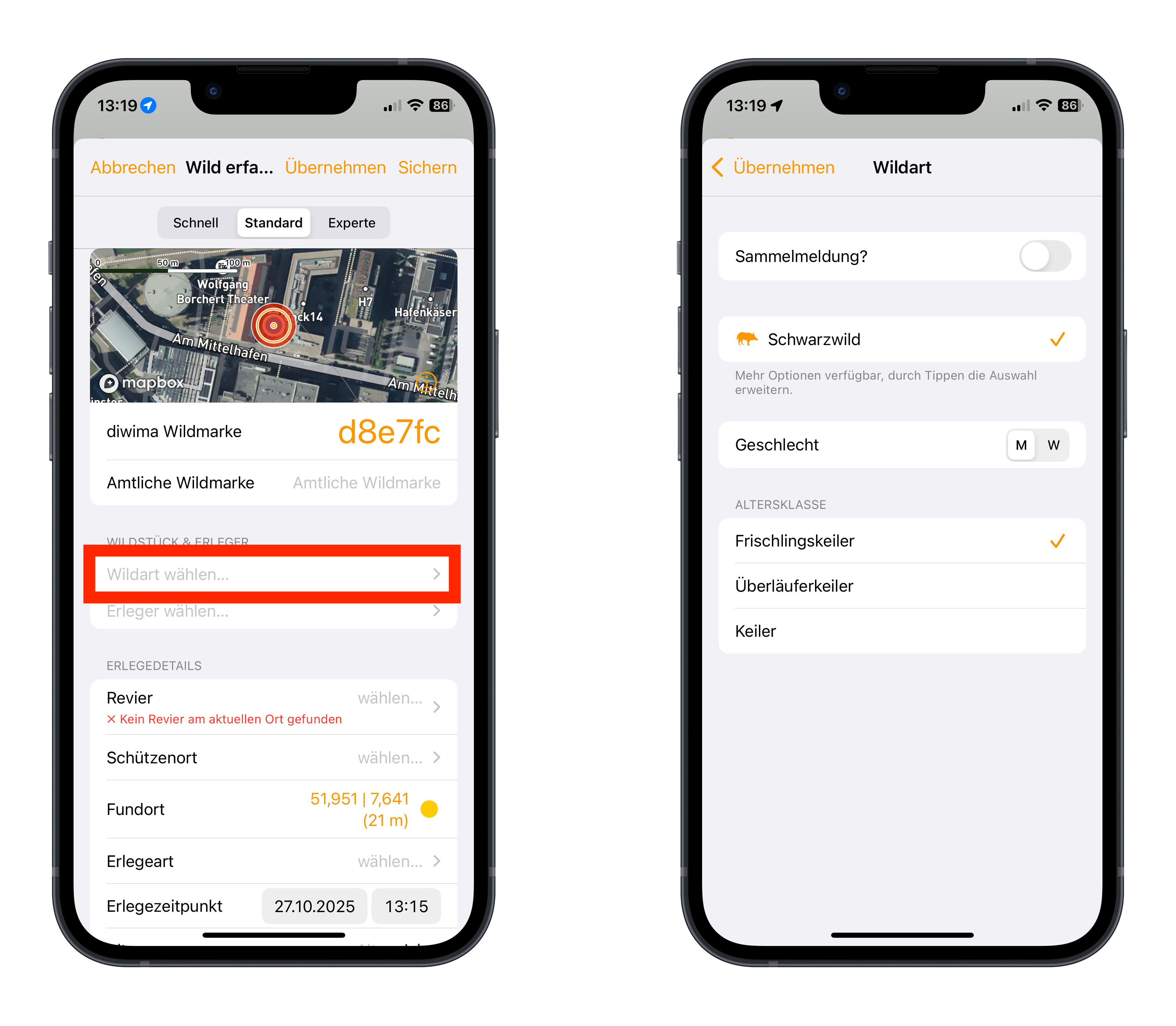 - Tippen Sie auf "Wildart wählen" und wählen Sie Wildart, Geschlecht und die Altersklasse des Stücks.