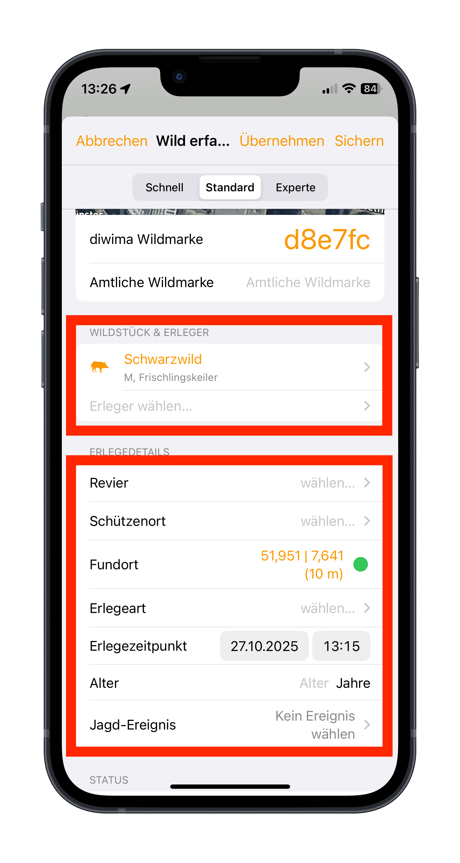 - Sie können zusätzlich weitere Erlegedetails angeben. Zunächst geben Sie das Revier und den Schützenort an. Der Fundort wird über die GPS Koordinaten Ihres Smartphones ermittelt. Achten Sie darauf, dass die Angabe möglichst genau ist (grüne Ampel). Eine ausführliche Anleitung zum Erfassen von Wildstücken finden Sie hier.