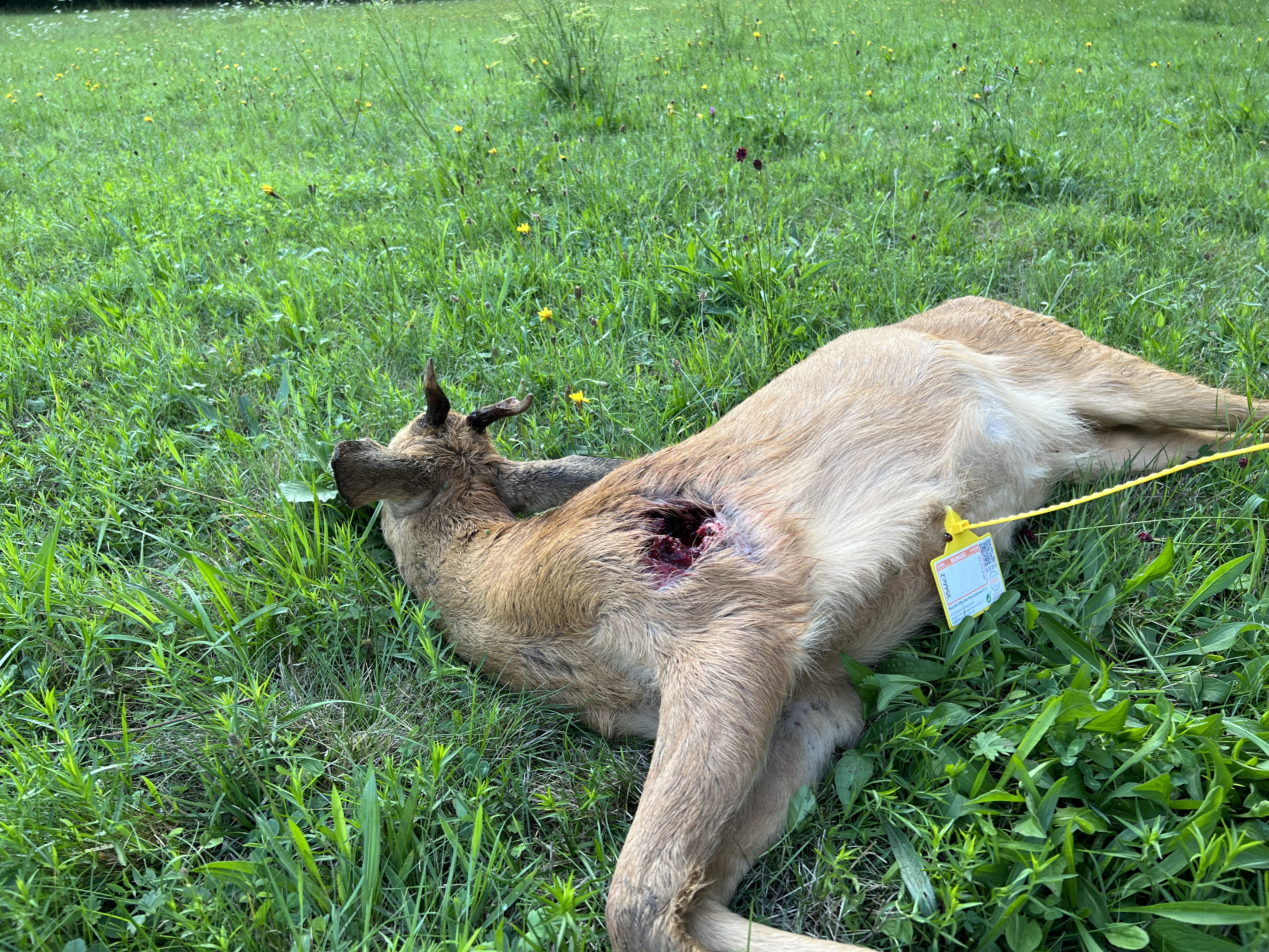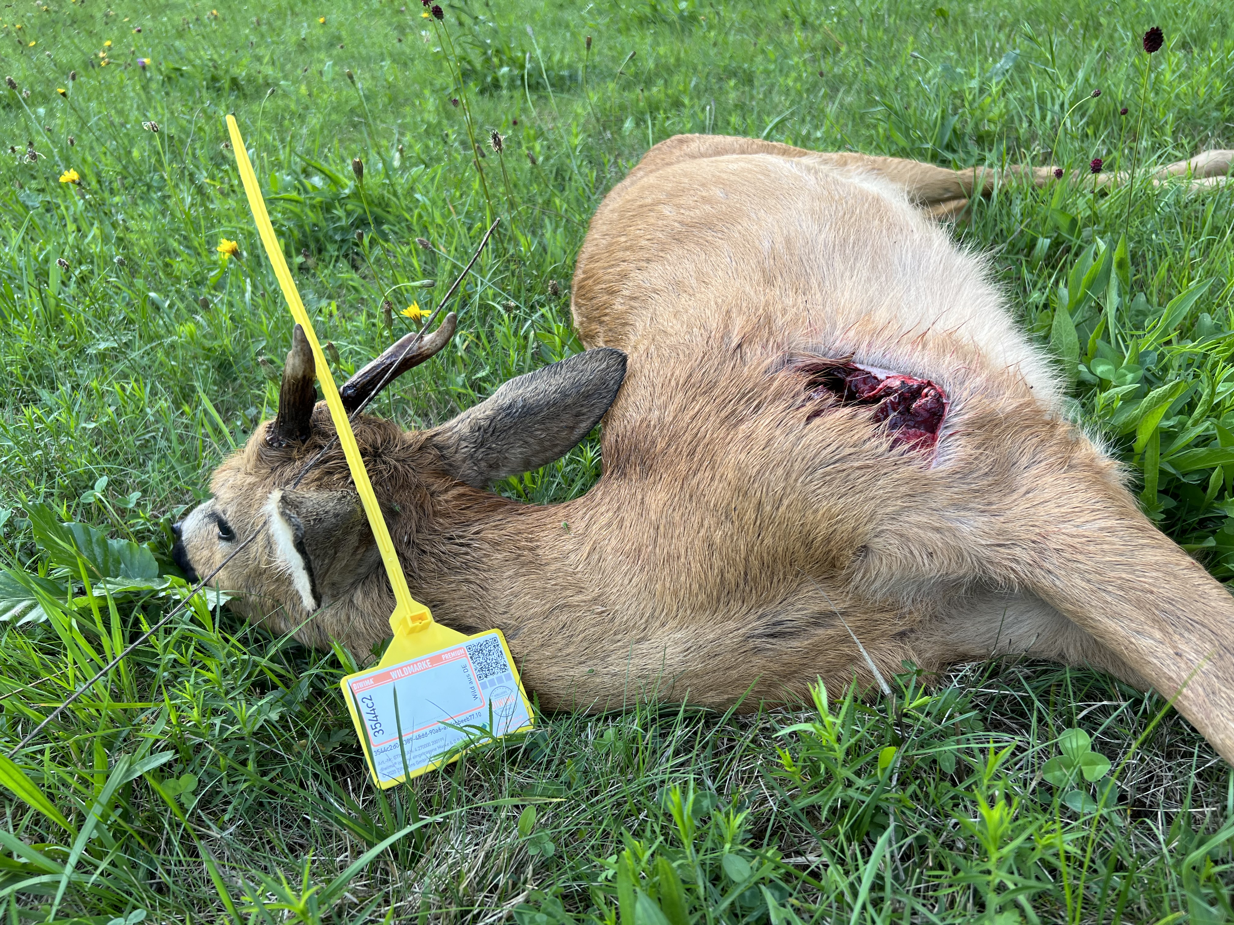 1. Bild des unaufgebrochenen Stückes mit individuellen Merkmalen des Hauptes, des Auschusses und der diwima Wildmarke am Erlegungsort