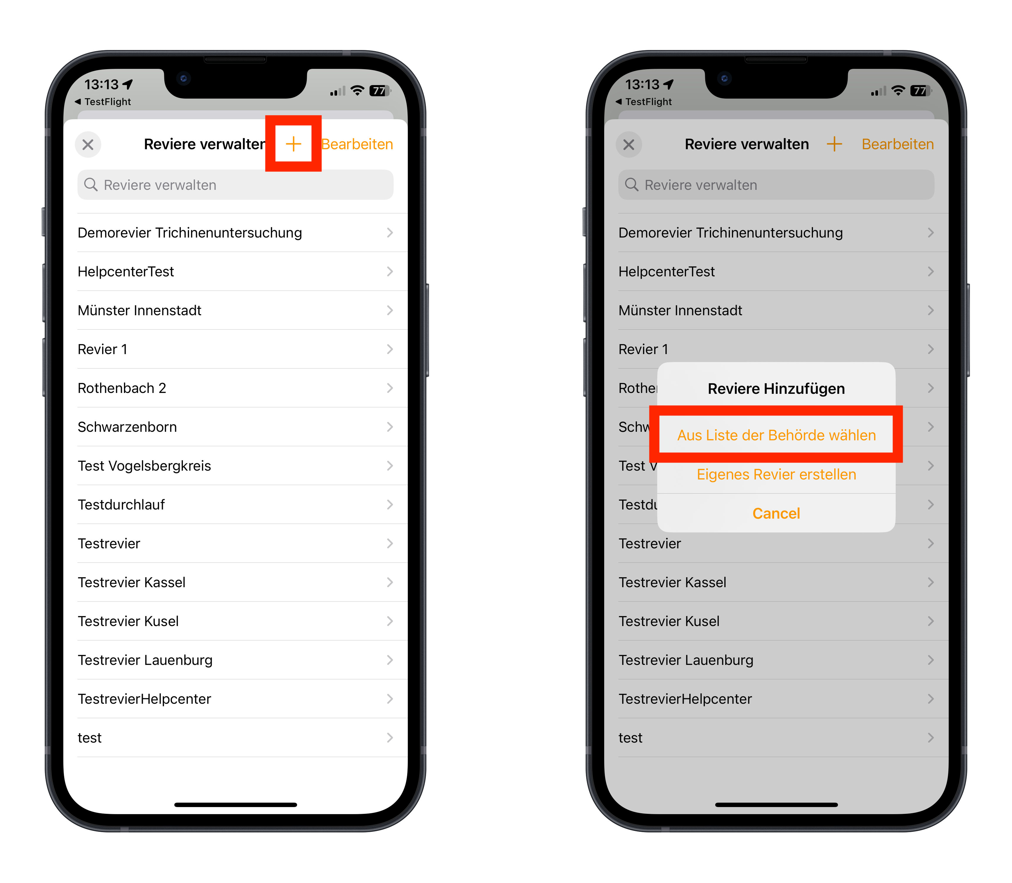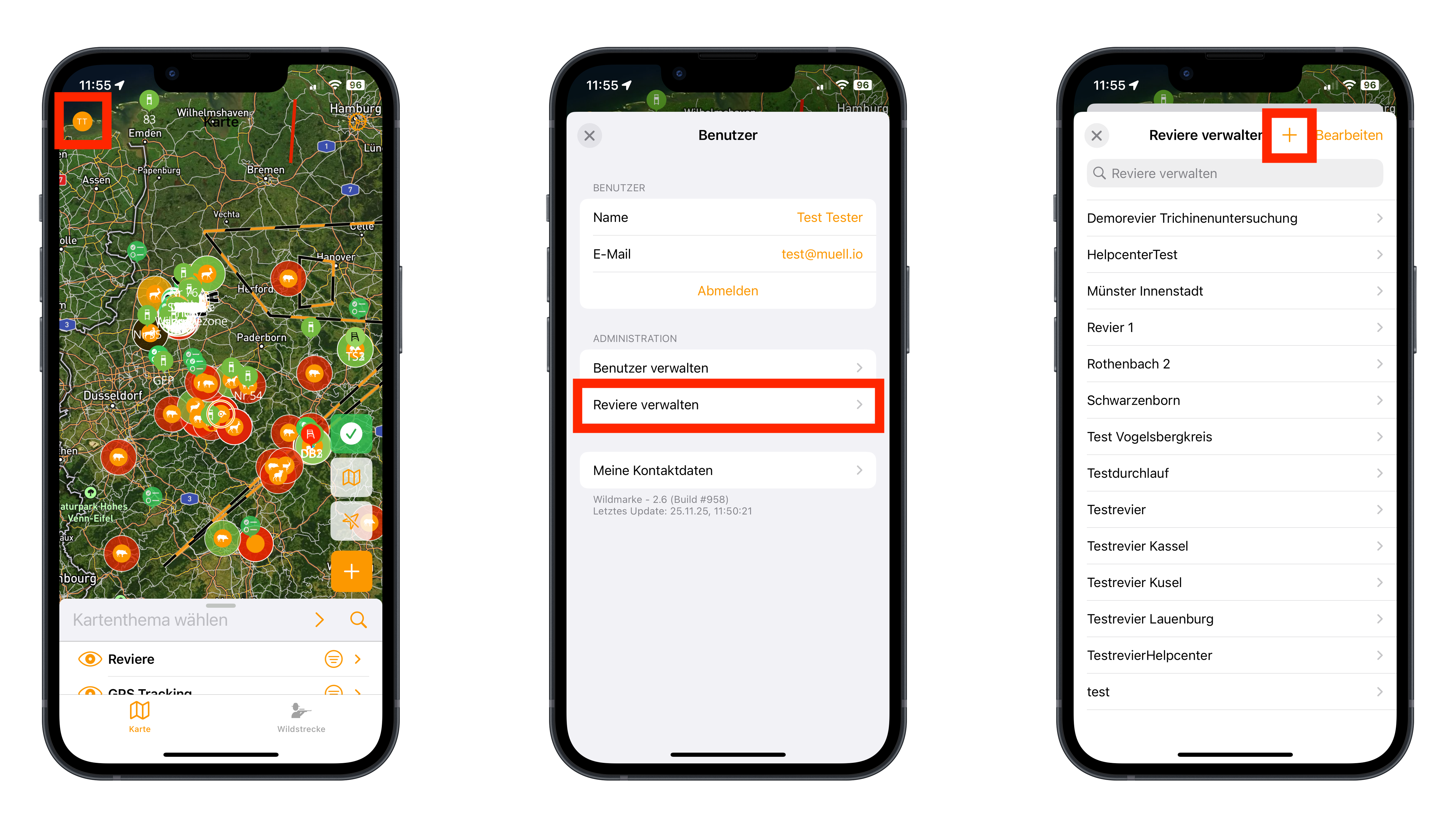 - Klicken Sie auf "Reviere verwalten" und anschließend auf das "+ Symbol", um ein neues Revier hinzuzufügen. Klicken Sie auf "Eigenes Revier erstellen".