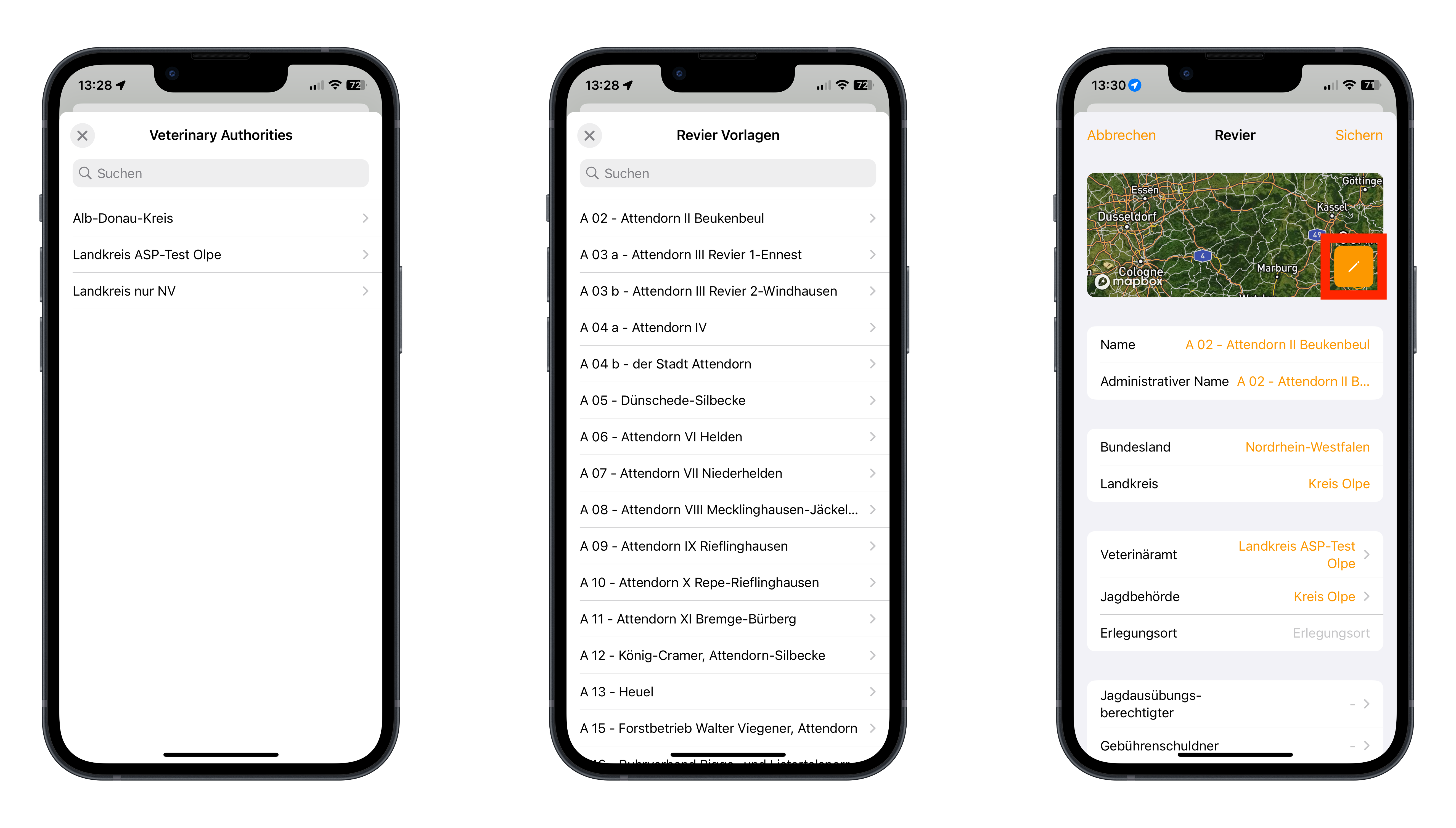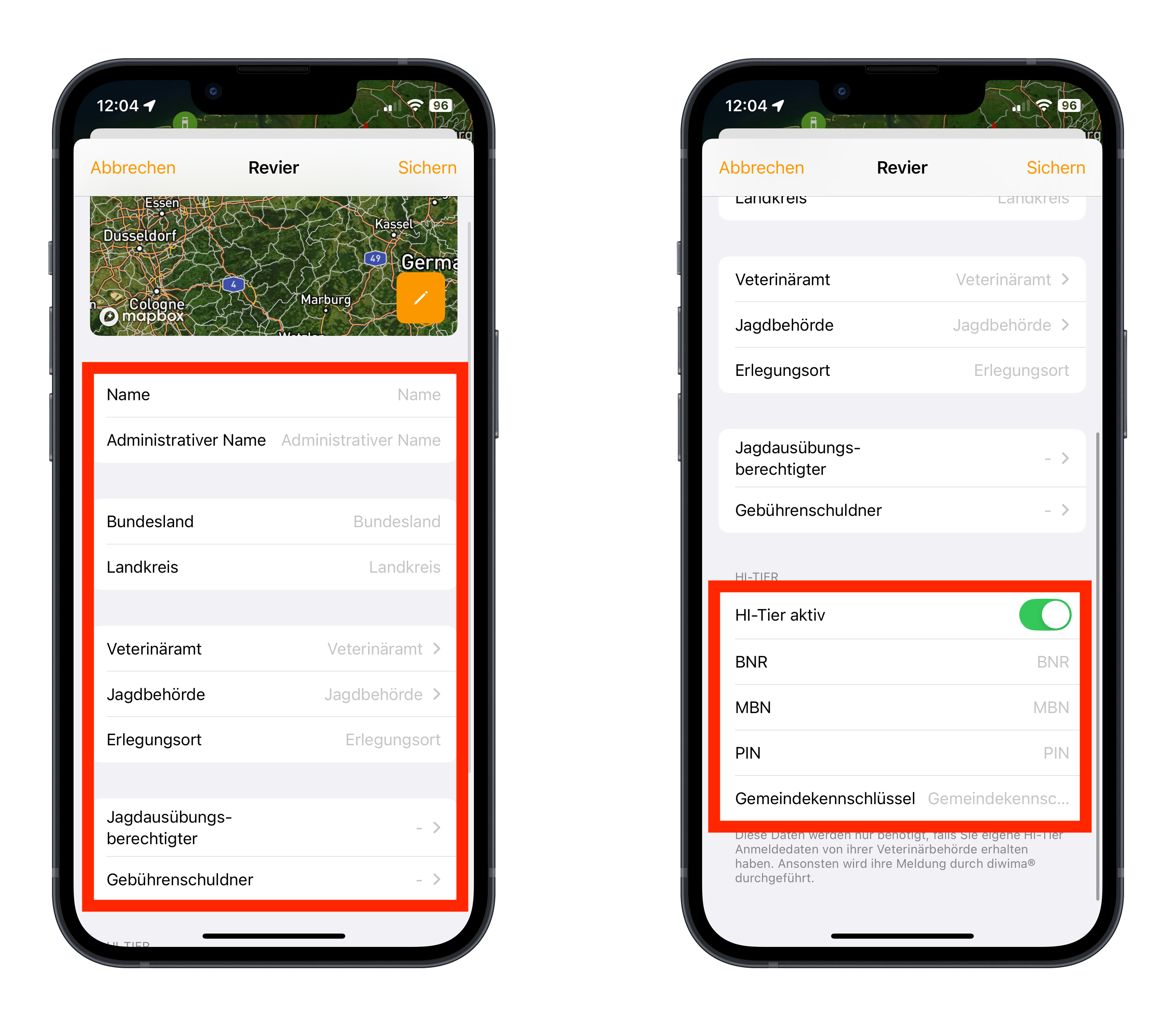 - Geben Sie alle relevanten Informationen an (Name, Veterinäramt, Jagdausübungsberechtigter etc.) und sichern Sie diese.
