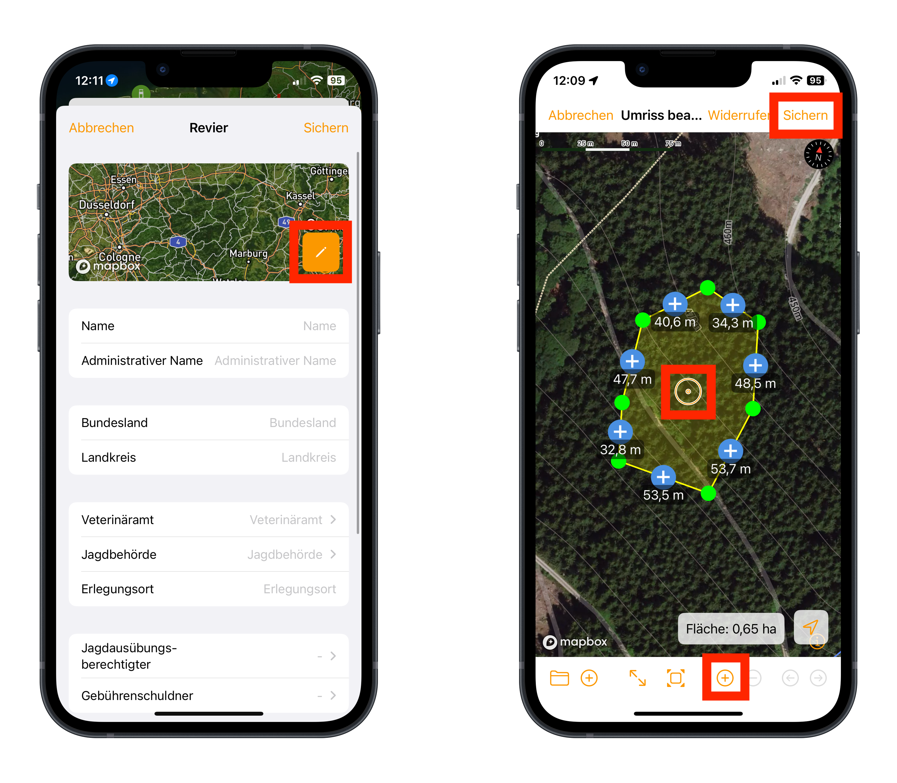 - Um die Reviergrenzen einzuzeichnen, tippen Sie auf das Stift-Symbol.