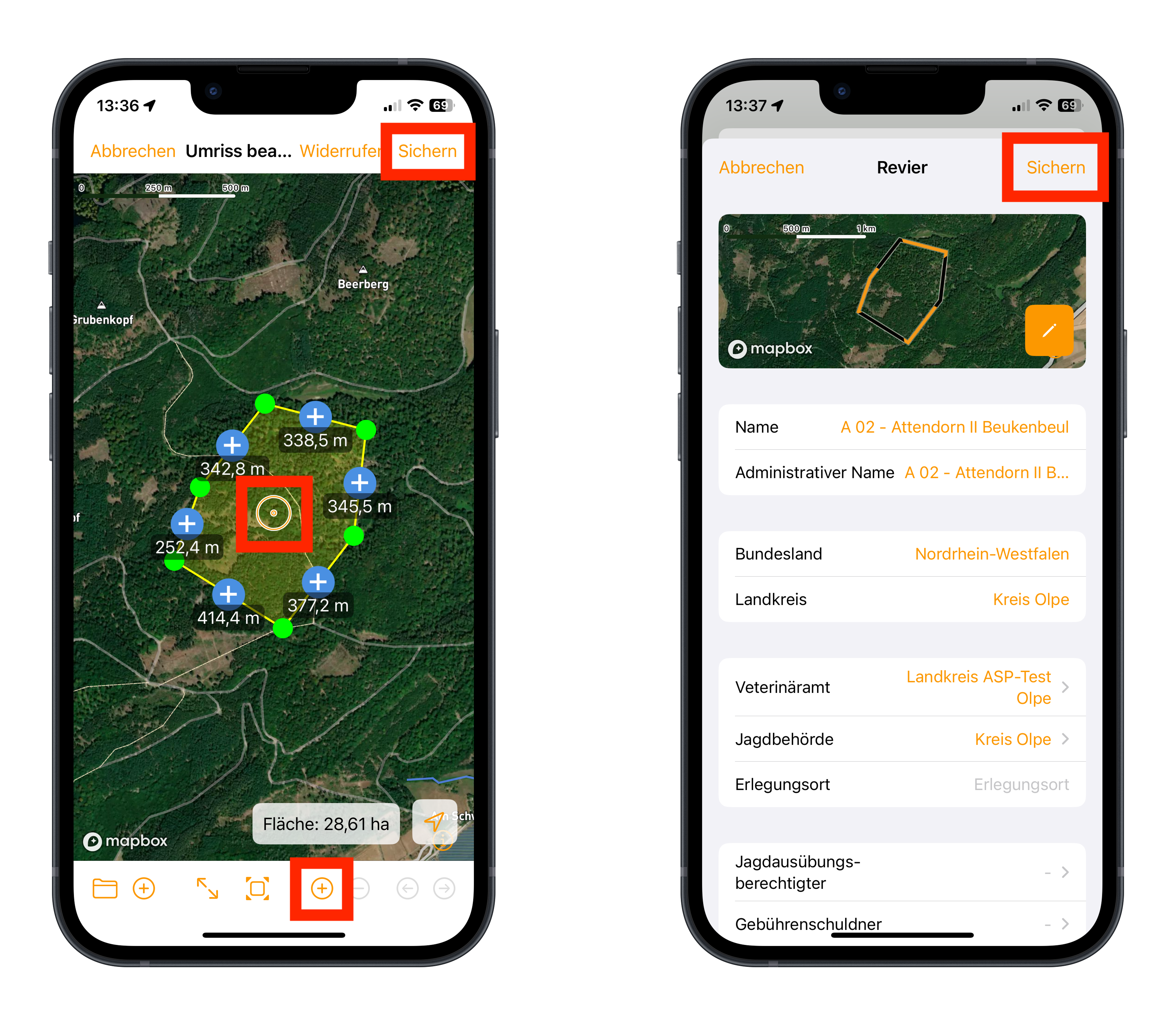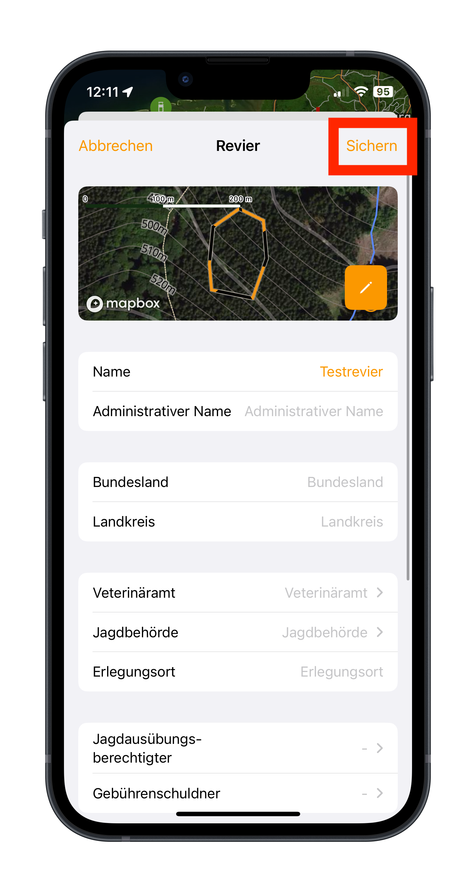 - Nachdem Sie alle Informationen eingetragen haben, klicken Sie ein weiteres mal auf "Sichern", um Ihr Revier zu speichern.