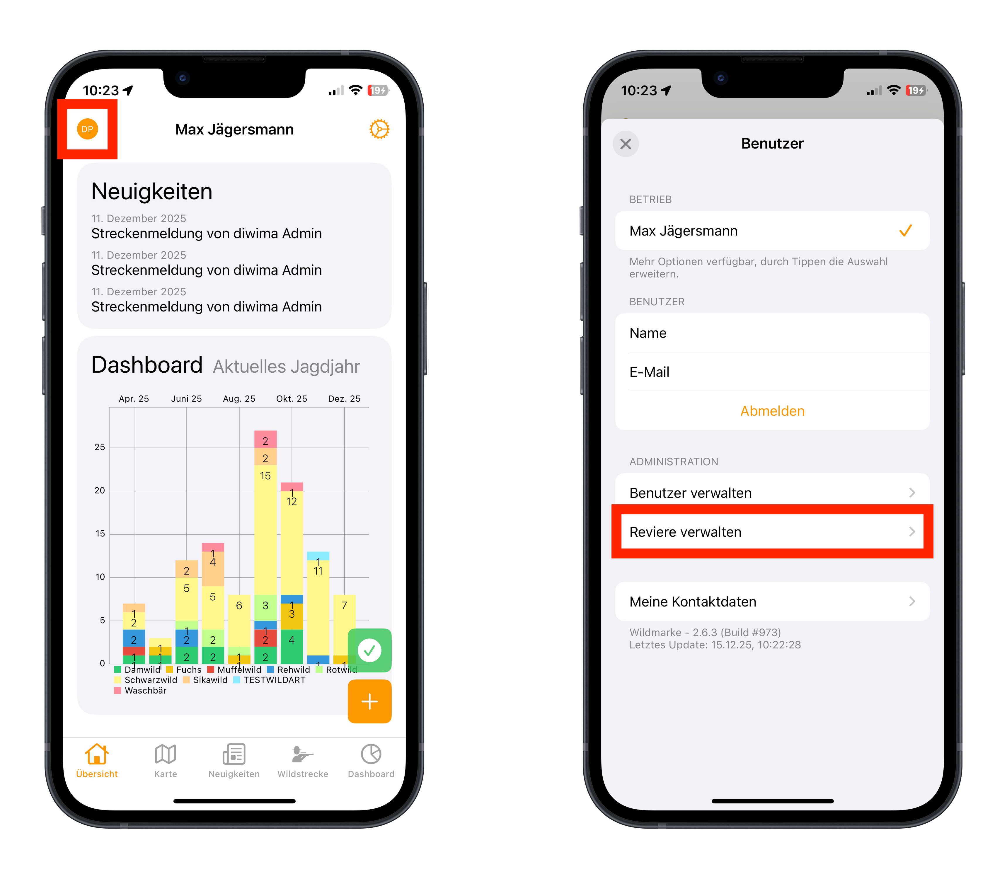 - Klicken Sie auf das Benutzer-Symbol oben links und anschließend auf "Reviere verwalten".