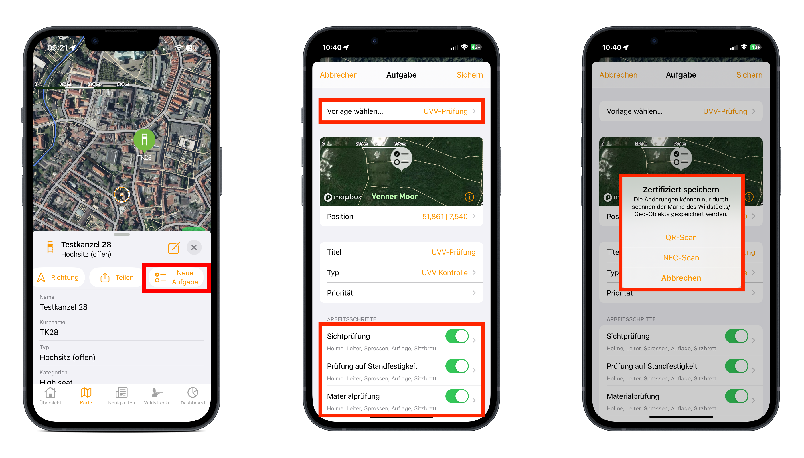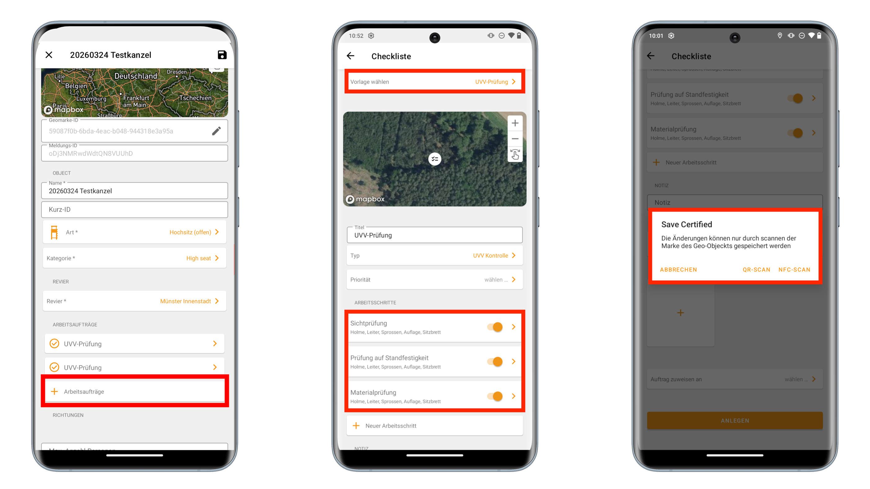 Mit diwima können Sie Ihre jährliche Hochsitzkontrolle (UVV-Kontrolle) zertifiziert durchführen und digital speichern. Papierformulare und handschriftliche Protokolle sind somit nicht mehr erforderlich. Die Kontrolle kann jederzeit direkt vor Ort durchgeführt werden, wenn Sie sich an der Einrichtung befinden.