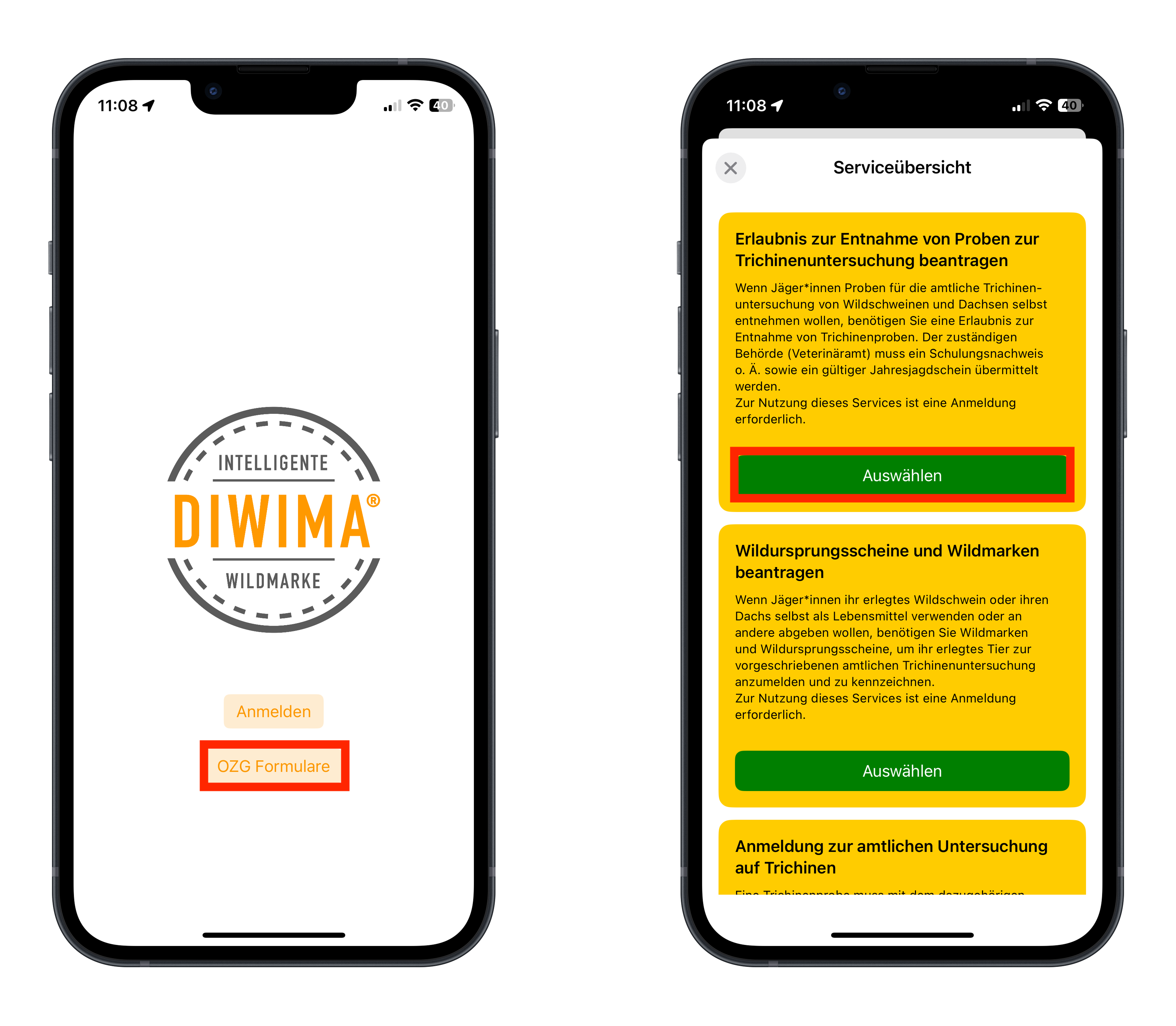 - Klicken Sie bei "Erlaubnis zur Entnahme von Proben zur Trichinenuntersuchung beantragen" auf "Auswählen"