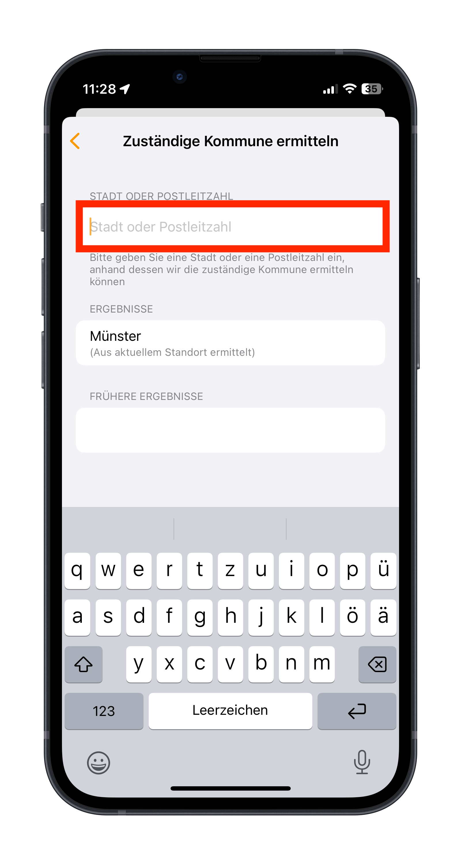 Um die Erlaubnis zur Entnahme von Proben zur Trichinenuntersuchung zu beantragen, müssen Sie zunächst Ihre zuständige Kommune ermitteln. Ihnen wird automatisch Ihre zuständige Kommune basierend auf Ihrer aktuellen GPS Position vorgeschlagen. Alternativ können Sie Ihre Stadt/Postleitzahl in die Suchleiste eingeben. Wählen Sie die gewünschte Kommune aus.