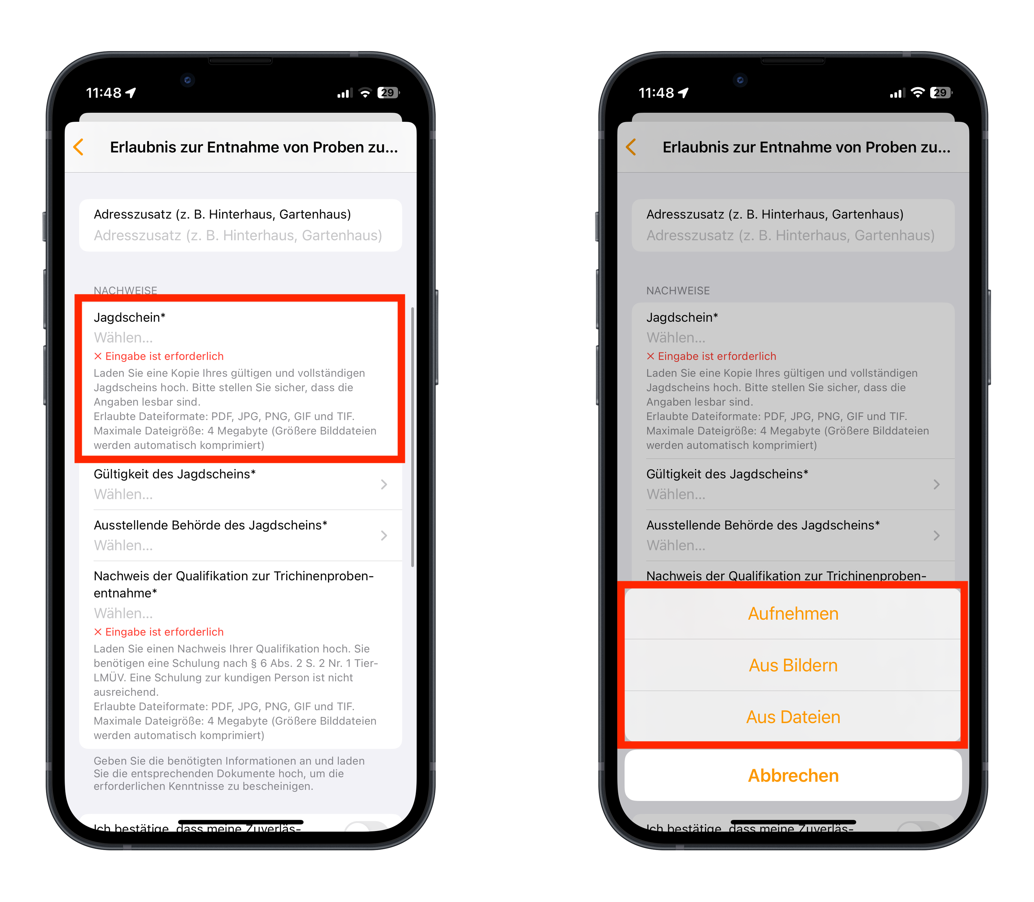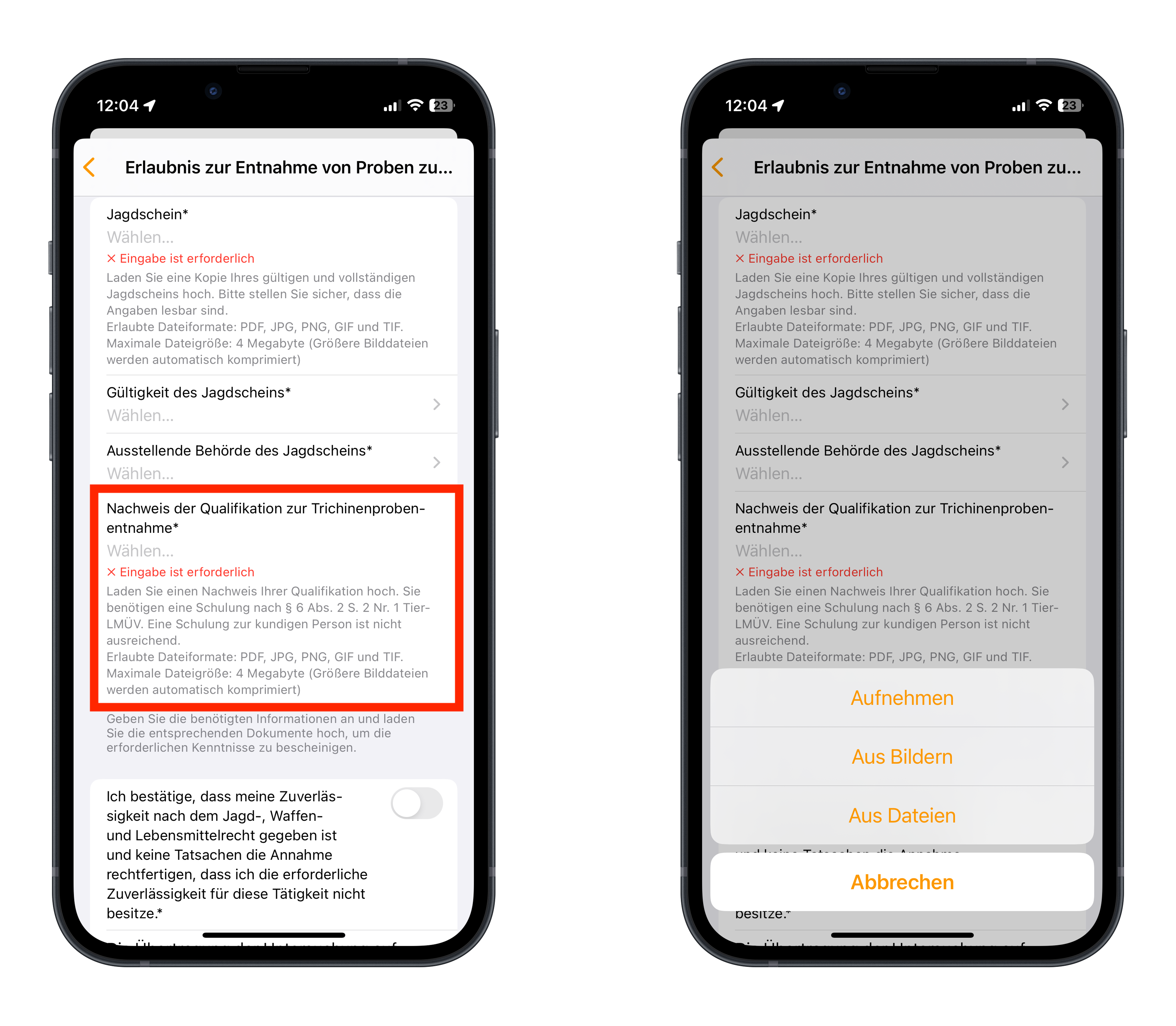 - Klicken Sie abschließend auf "Nachweis der Qualifikation zur Trichinenprobenentnahme" und laden Sie einen Nachweis Ihrer Qualifikation hoch.