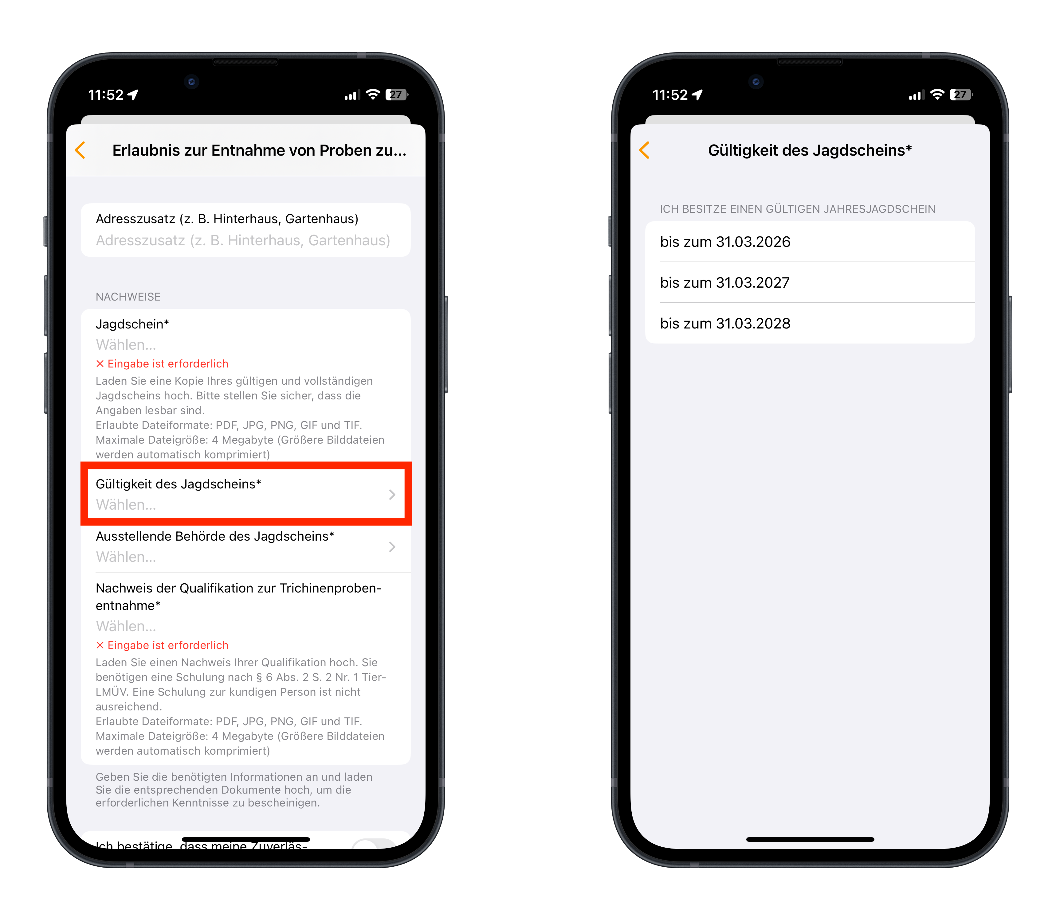 - Tippen Sie als nächstes auf "Gültigkeit des Jagdscheins" und wählen Sie aus, bis wann Ihr Jagdschein gültig ist