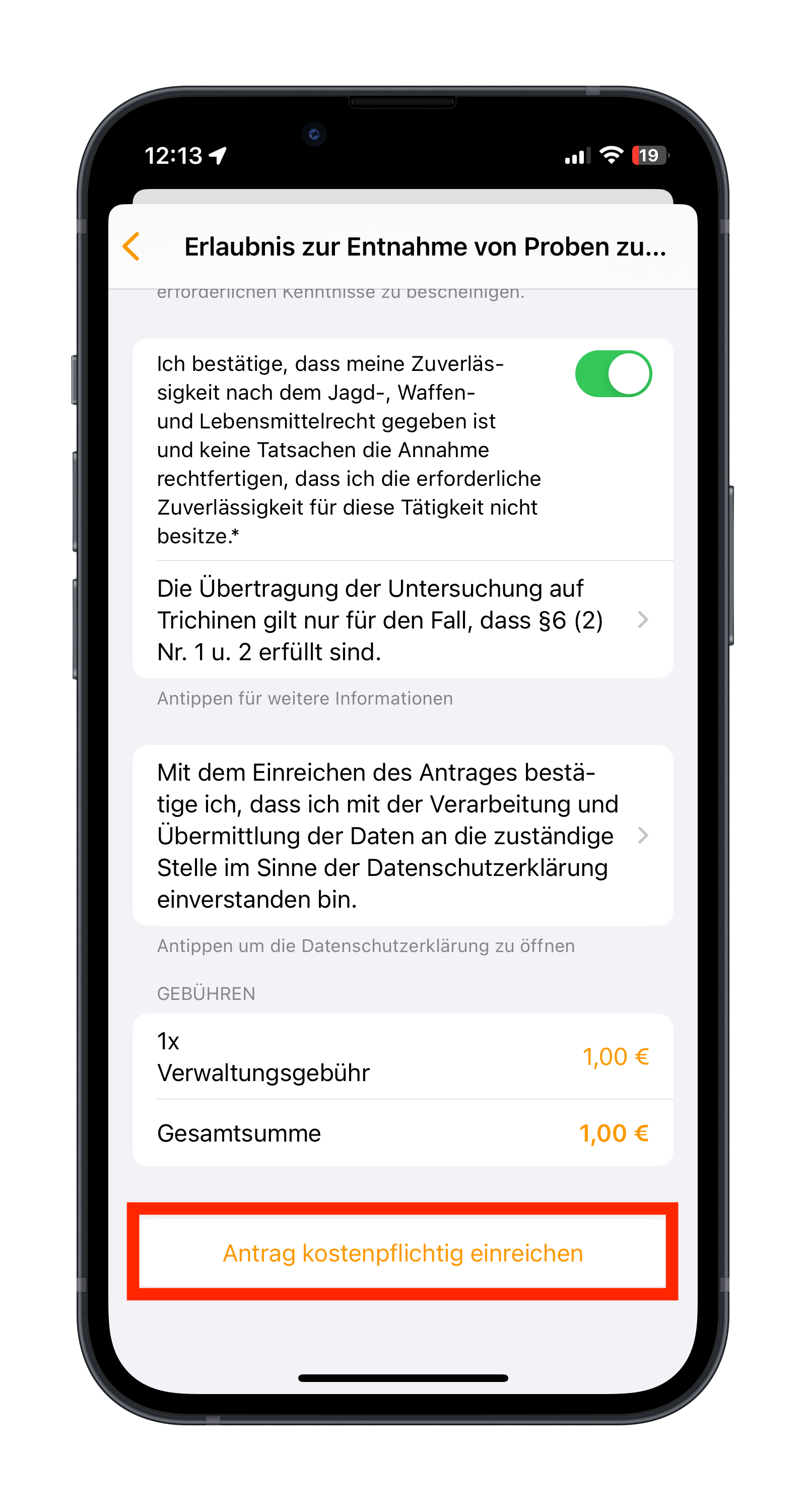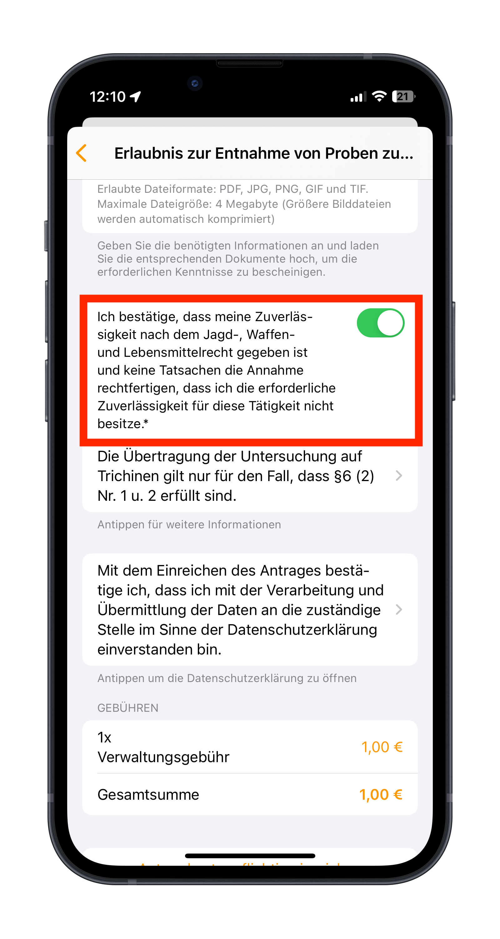 Um den Antrag abschließen zu können, müssen Sie bestätigen, dass Ihre Zuverlässigkeit nach dem Jagd-, Waffen- und Lebensmittelrecht gegeben ist und keine Tatsachen die Annahme rechtfertigen, dass Sie die erforderliche Zuverlässigkeit nicht besitzen. Klicken Sie auf den Schalter, um die Bestätigung zu erteilen.